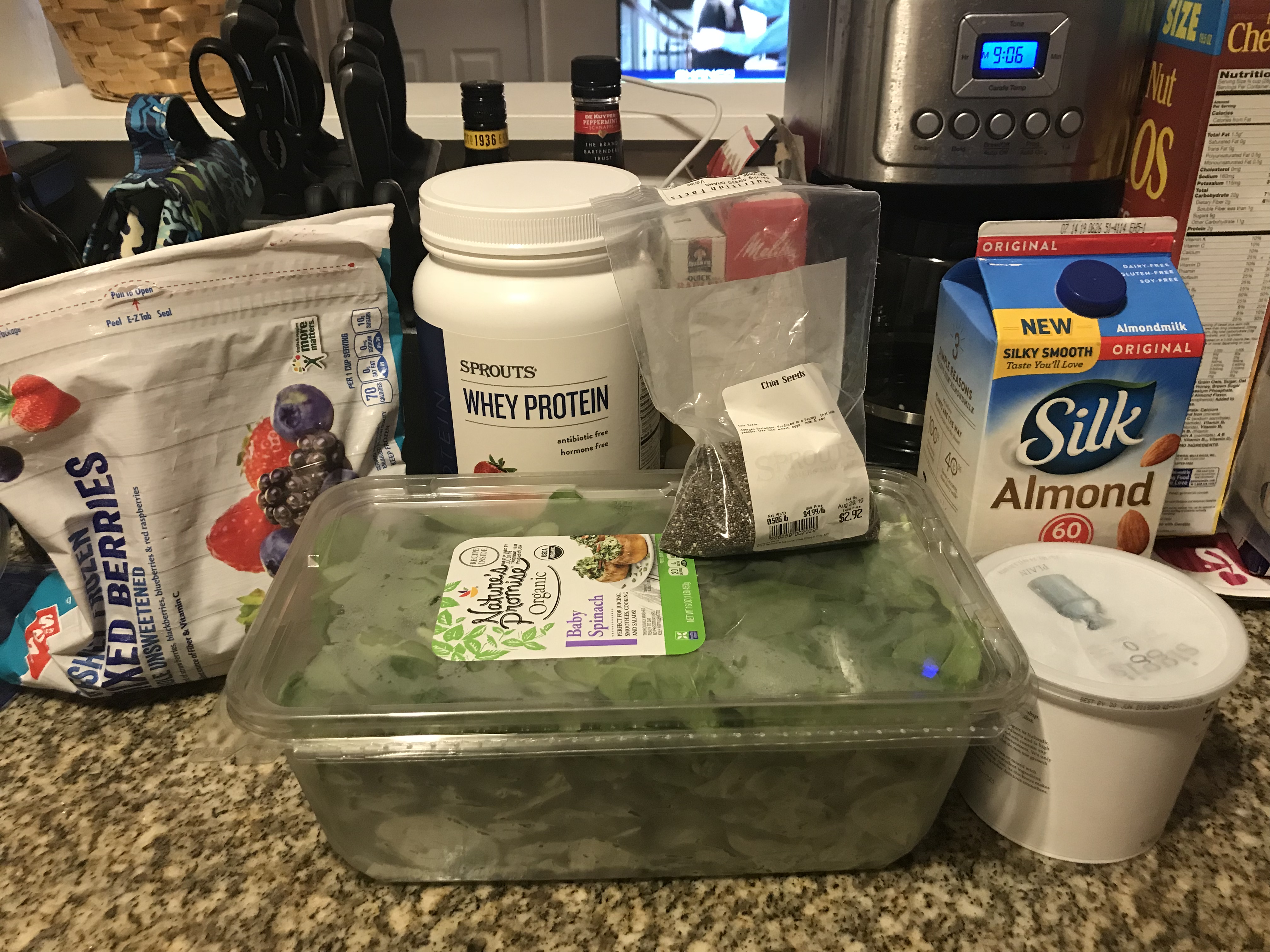 For breakfast, I drink a protein smoothie. I either make this Sunday night or Monday morning, and I make 4 servings at one time. Each serving contains 2 cups of raw spinach, 1/2 cup of Greek yogurt, 1/2 cup of soy milk, 3/4 cup of frozen and fresh fruit, 1 serving of whey protein, and a spoonful of chia seeds sprinkled on top. I’ll sometimes eat a fried egg with the smoothie.