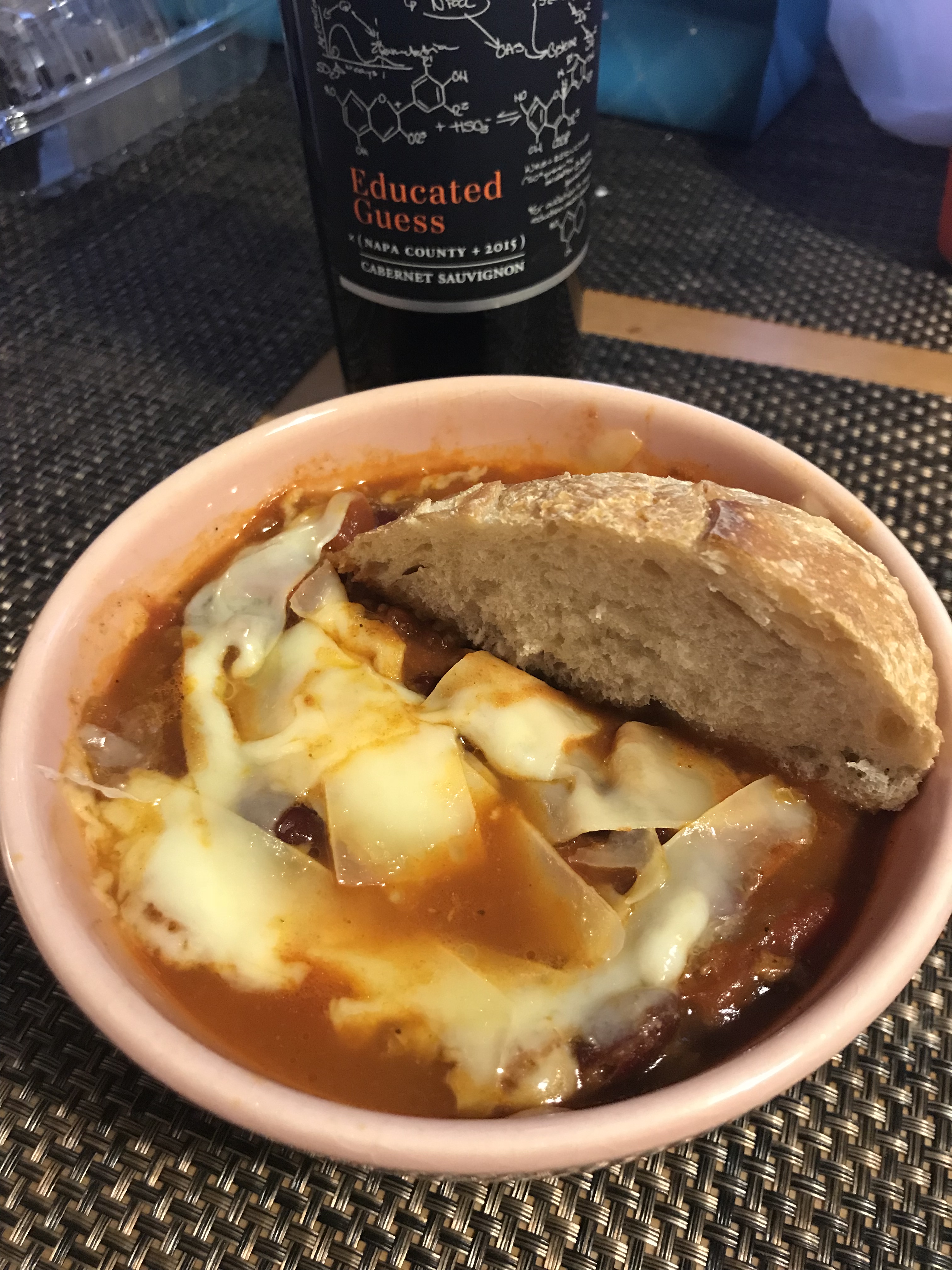 Each night, for one week, I ate a cup of chili with some melted parmesan on top and piece of sourdough on the side. There was wayyyy too much, though, and I ended up giving away about 3-4 servings. This chili lasted me for 1.5 weeks, even after I shared some with my neighbor!