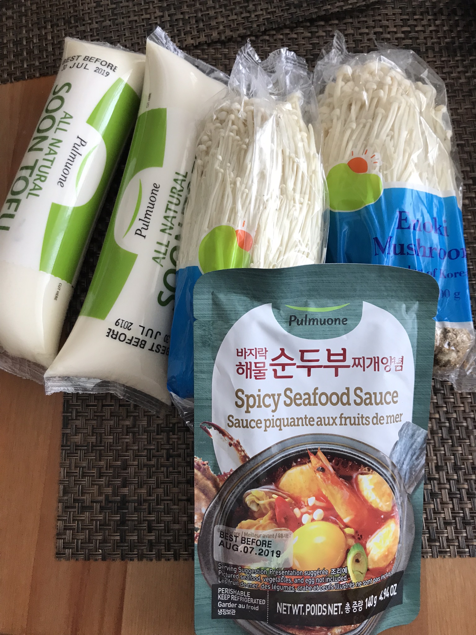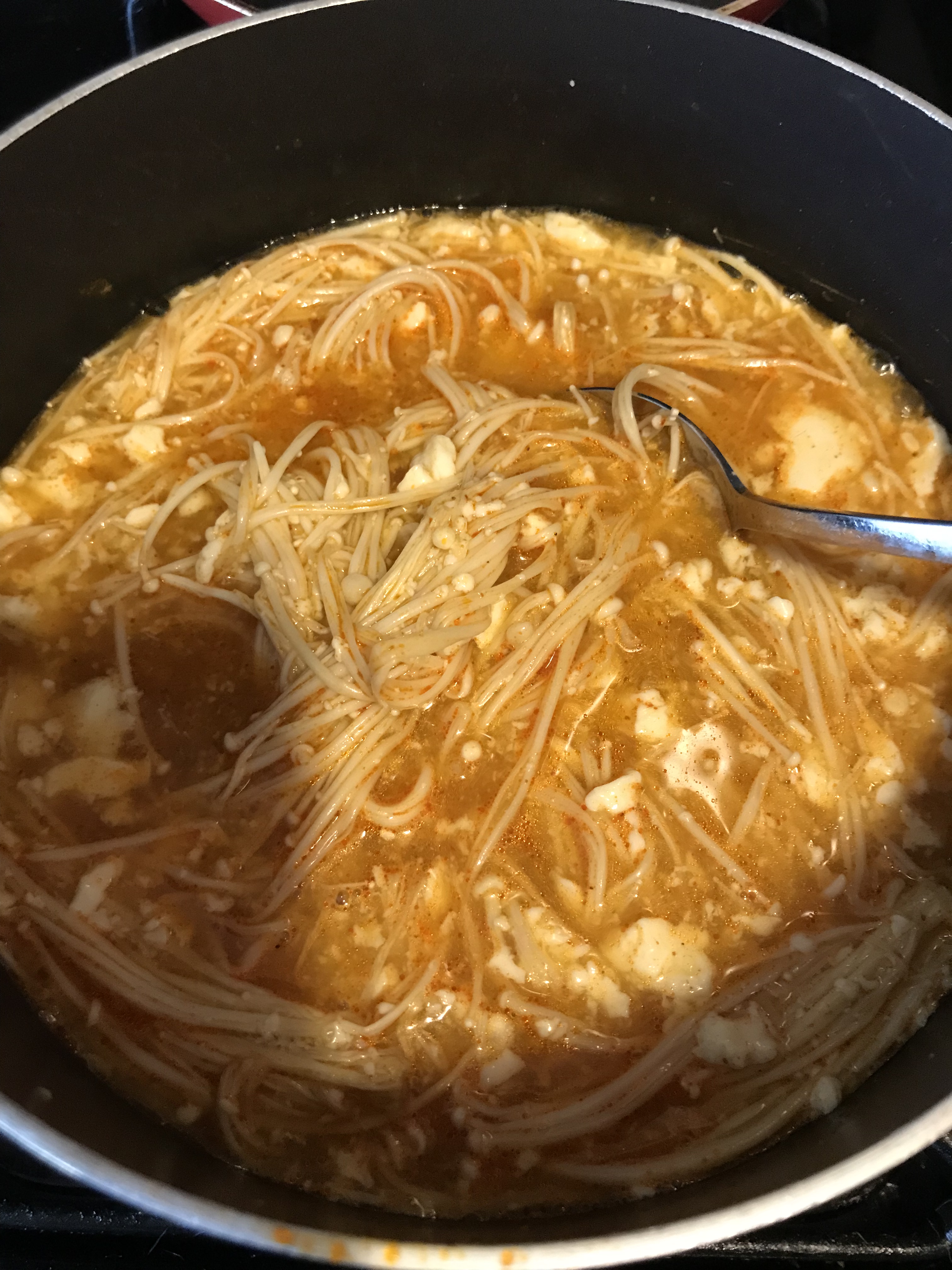 For dinner, I make a batch of soup either Sunday or Monday night that usually amounts to 3-4 servings. I’m a huge fan of the ready-to-make soups sold at Korean supermarkets. I sometimes make soondubu jjigae using a packaged stock base (just add water), soft tofu, enoki mushrooms, and two eggs.