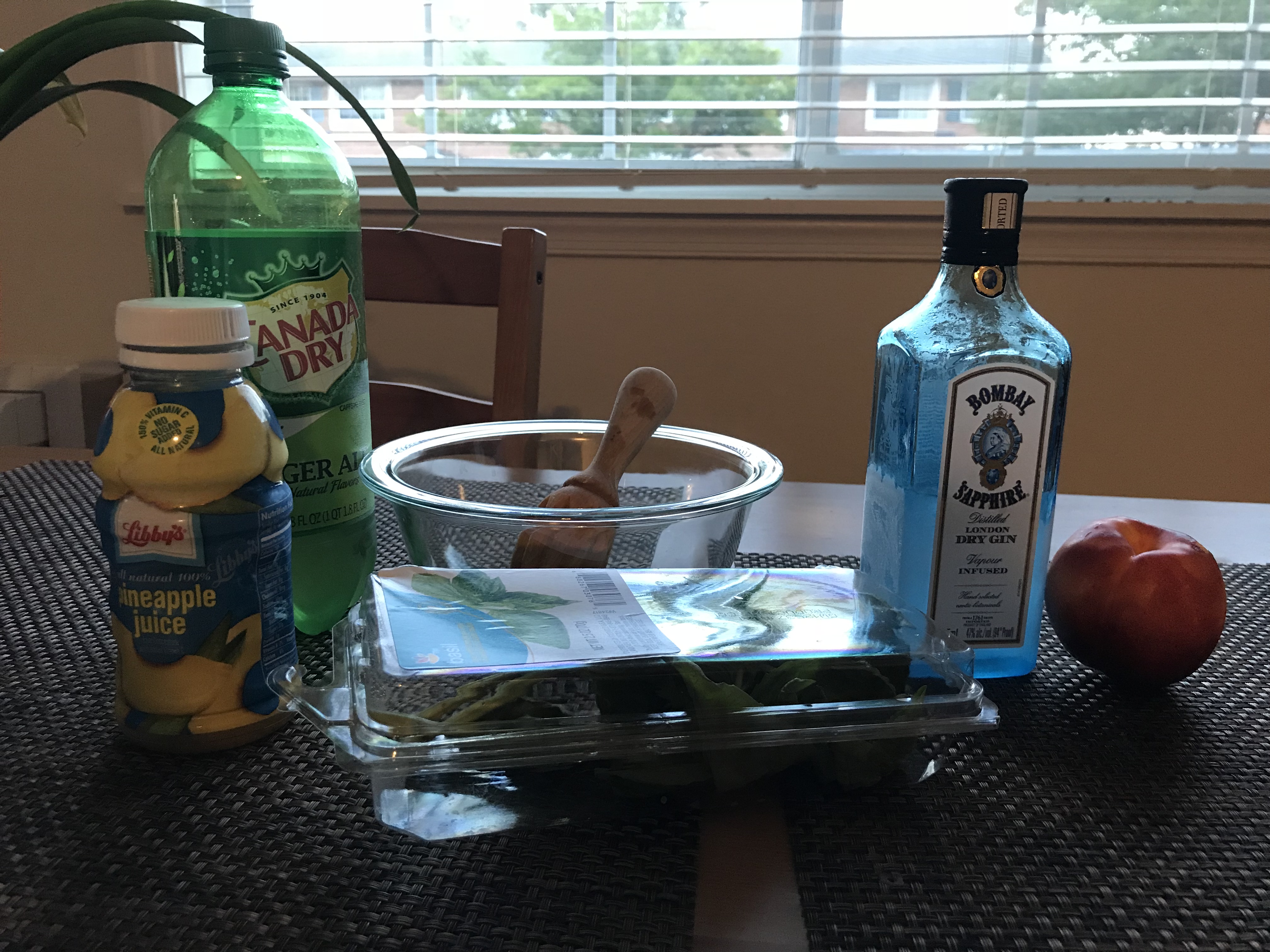3. Add 2 oz. of gin, 1.5 oz. of pineapple juice, and the muddled nectarine and basil to the shaker. Do not add the ginger ale yet! The shaker will pop open if you shake it when there’s soda in there.