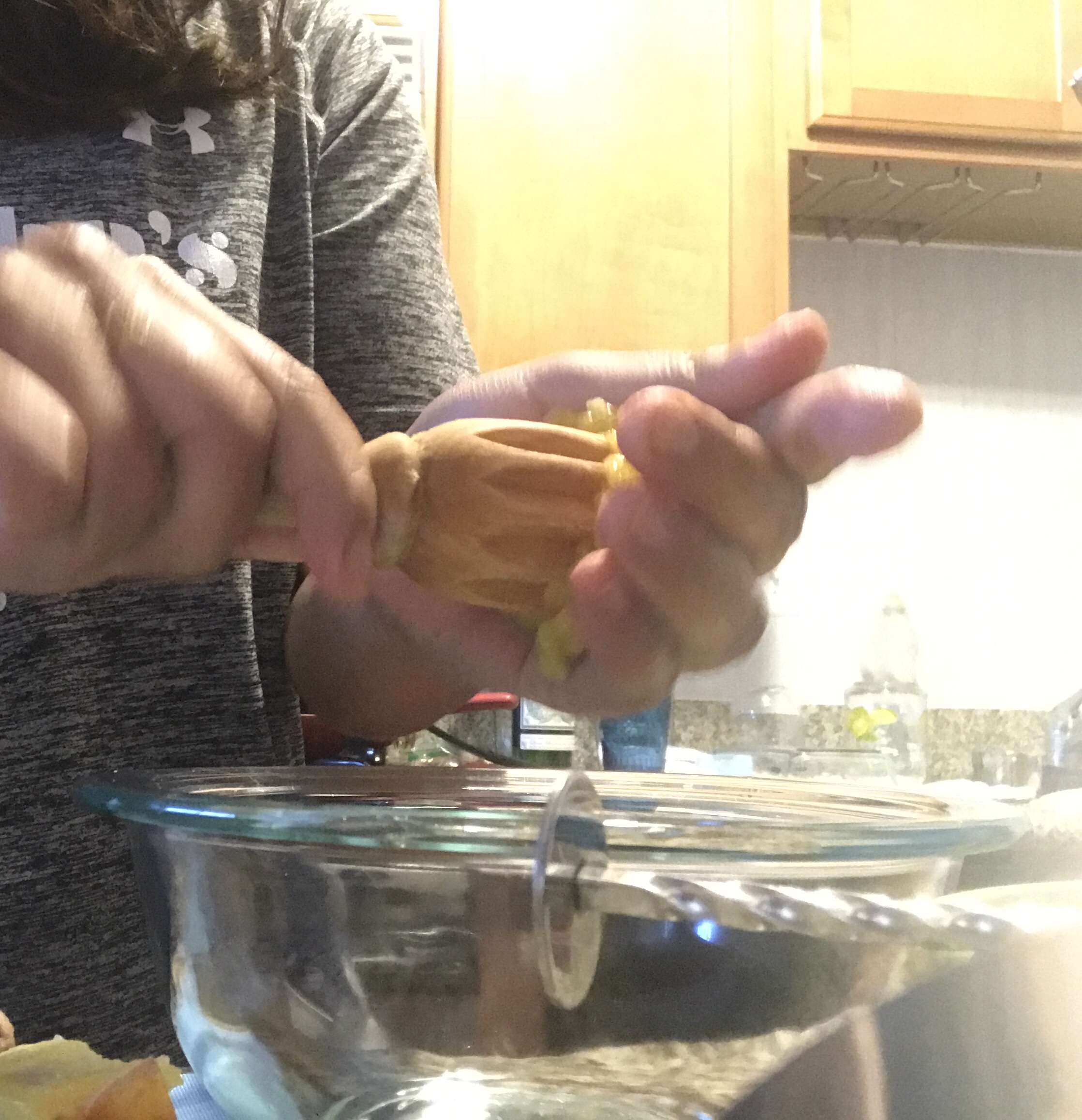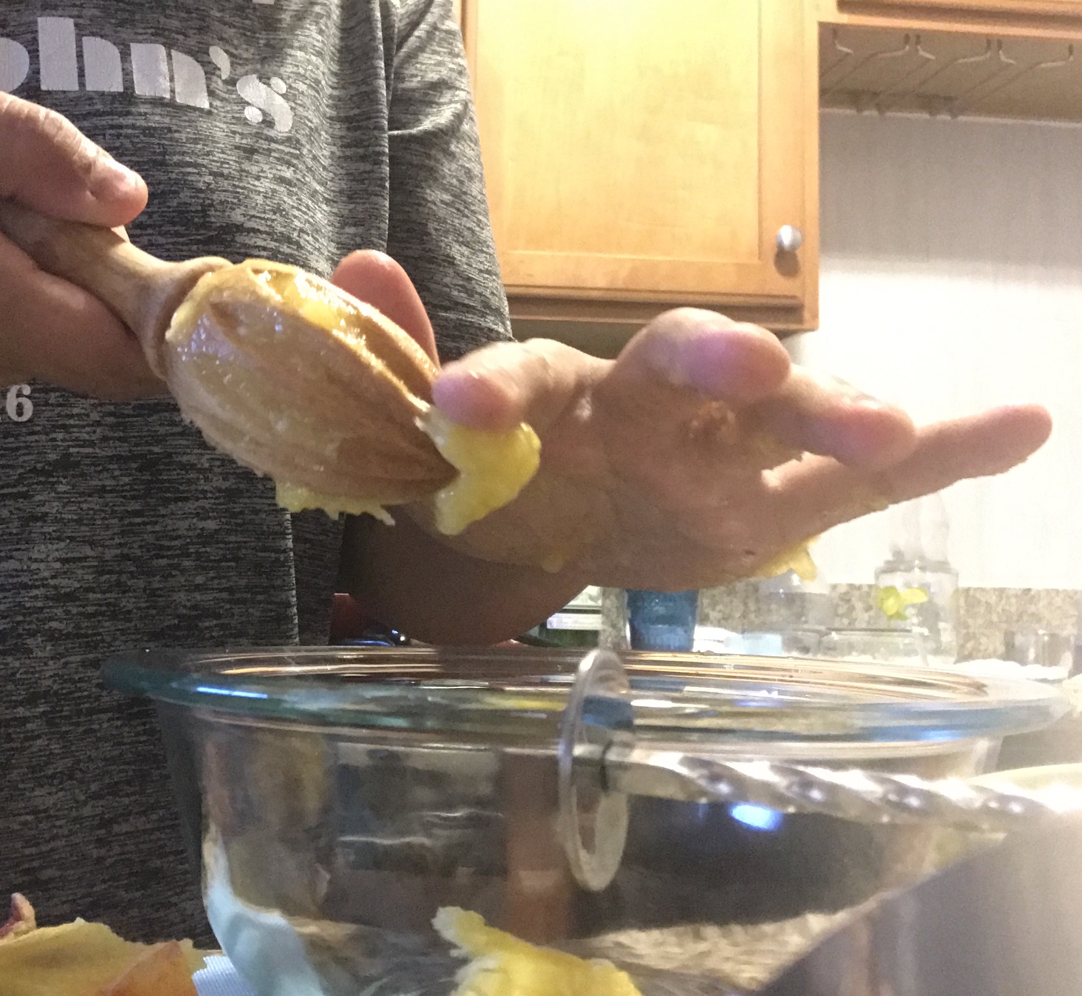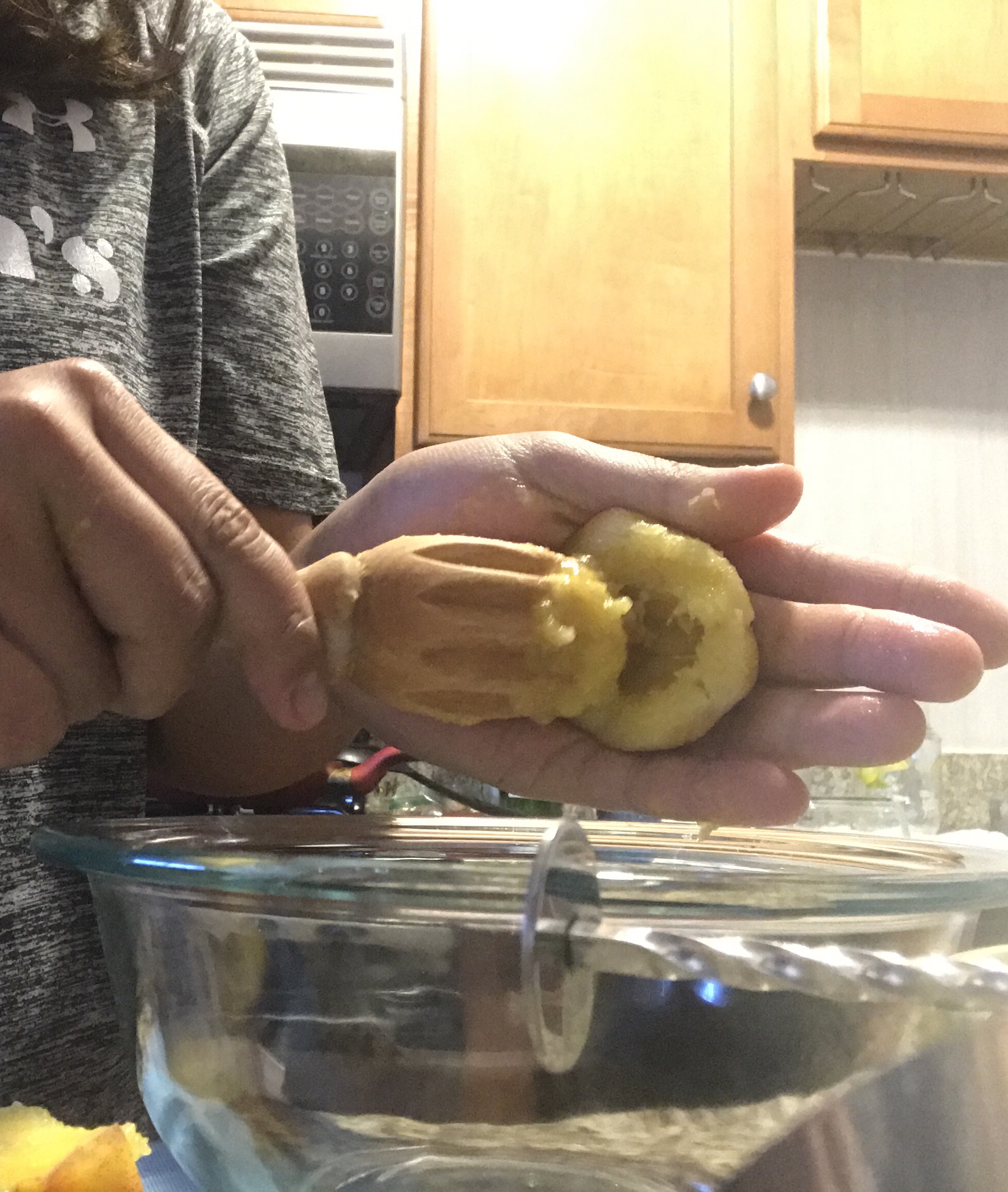 - Cut wide slices of the nectarine. I cut mine into fours. Then, use a reamer to squish out the inside of the fruit into a bowl. Try not to get any of the skin in there! Scrape off all the fruit from the reamer.