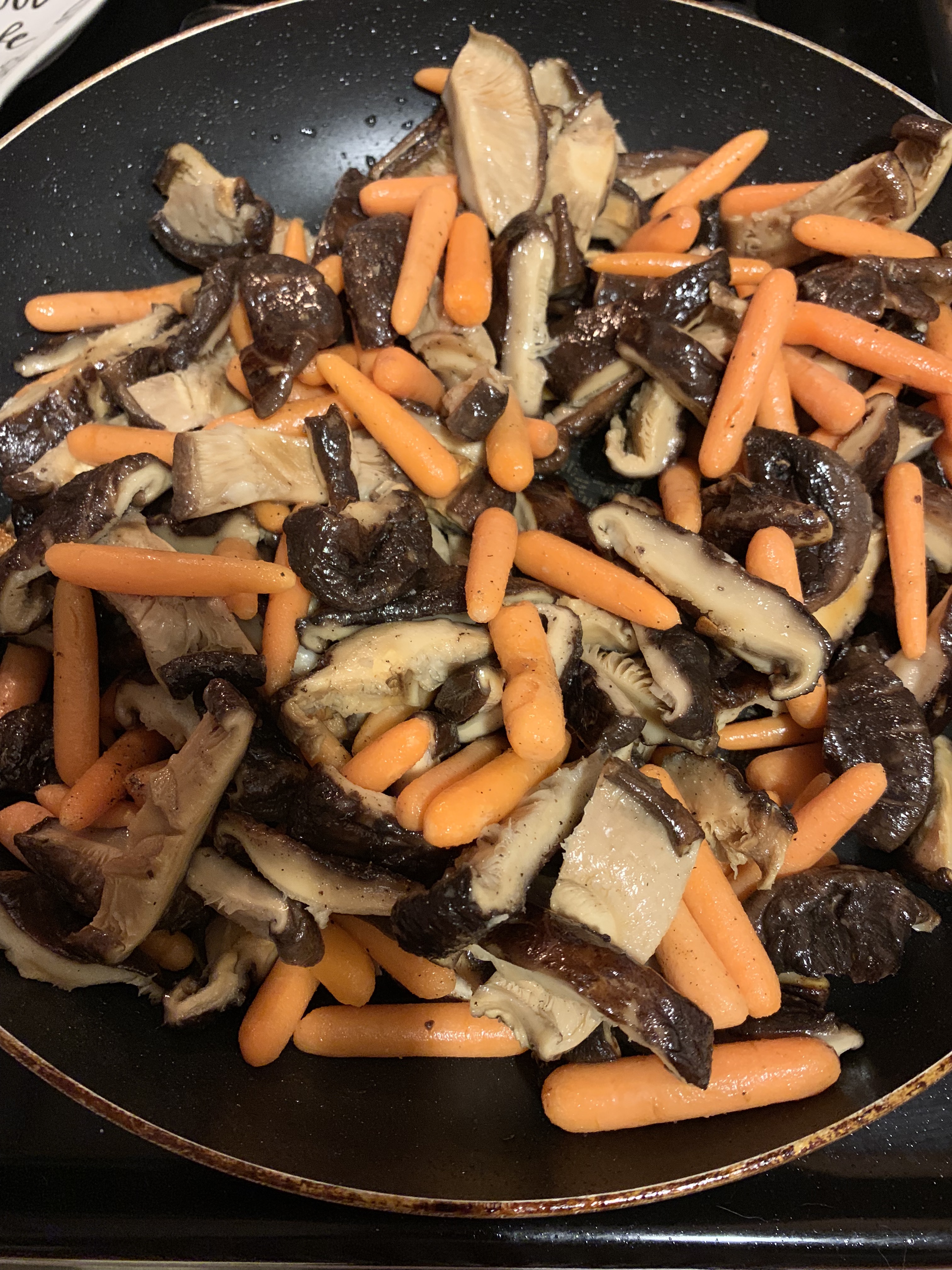 My mom usually cooks the mushrooms with hot green peppers, but I didn’t have any so I opted for the carrots I’ve been struggling to finish instead. You can add any fresh vegetable you want. I’d just recommend a vegetable that’s crisp and crunchy to balance out the textures!