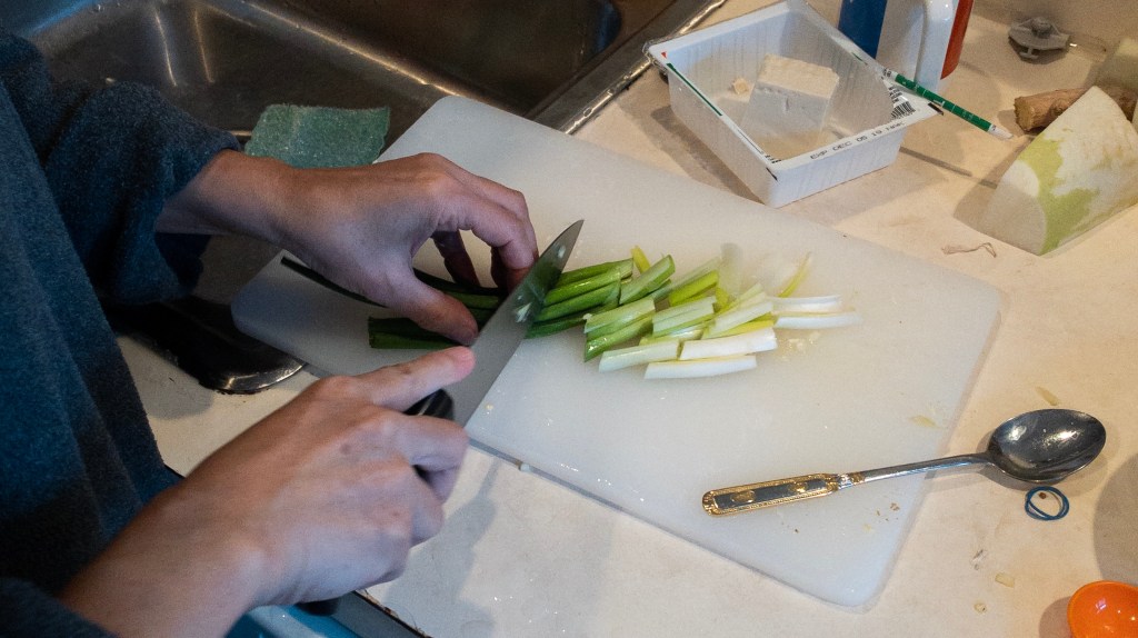 11. Cut the scallions. Lengthwise, first, to make them more narrow. And then cut them across.