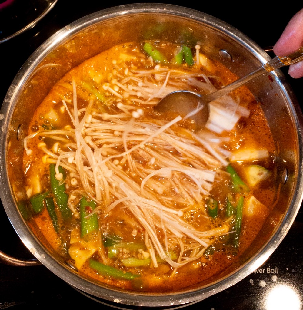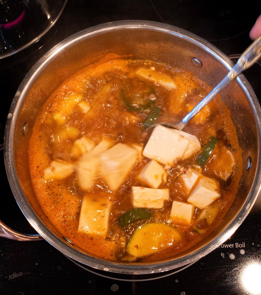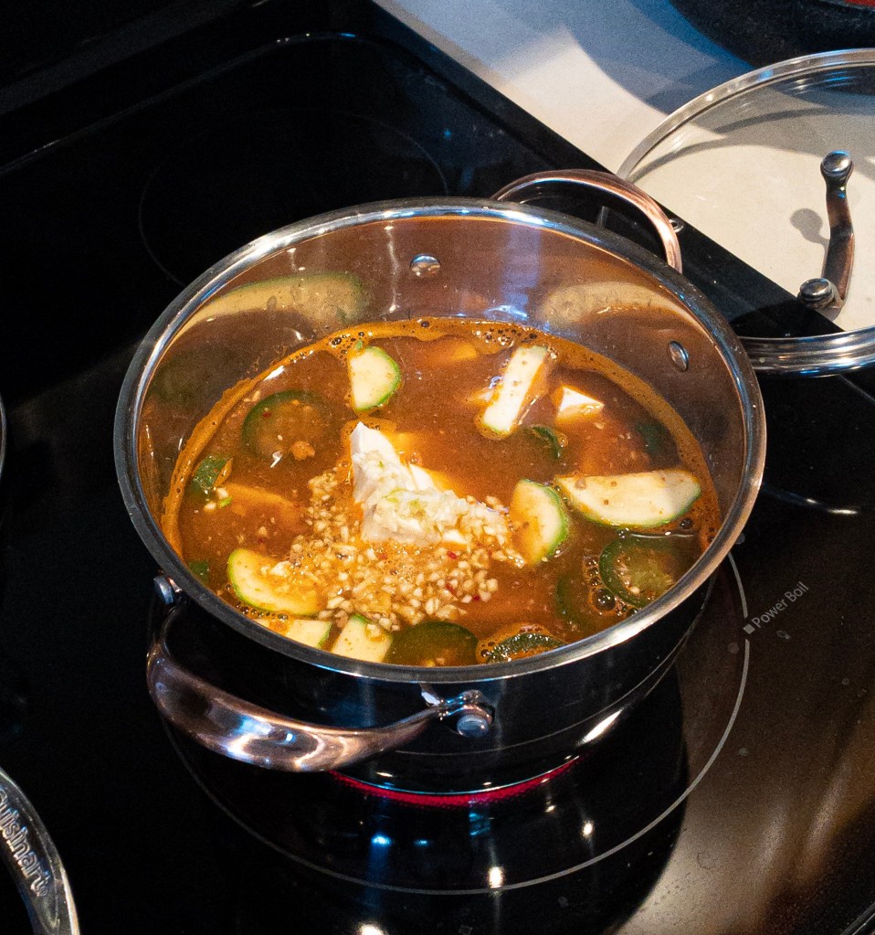 20. Once it starts boiling again, add the garlic, tofu, and zucchini. Keep the heat on high with the cover on top.