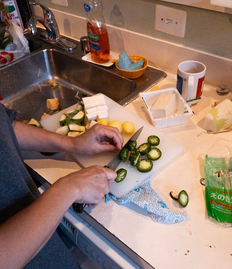 9. Cut your hot pepper, tofu, potatoes, and zucchini into the same sized pieces.