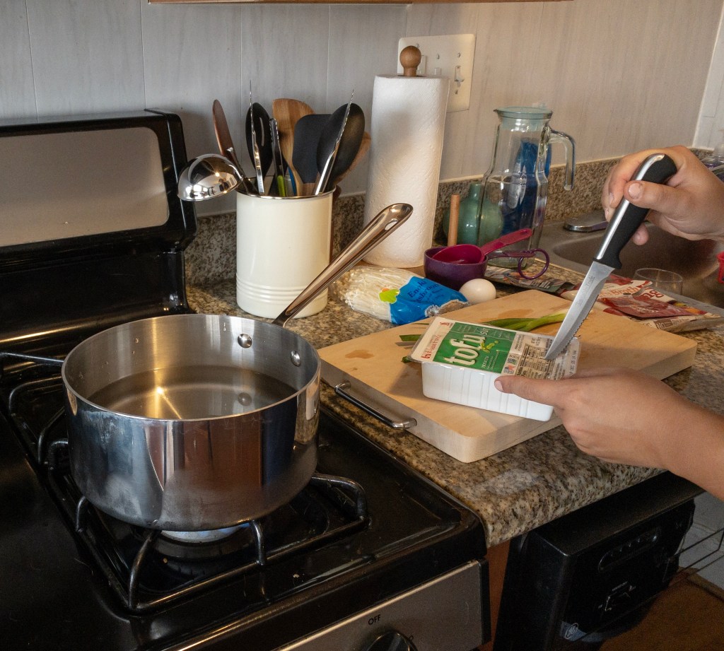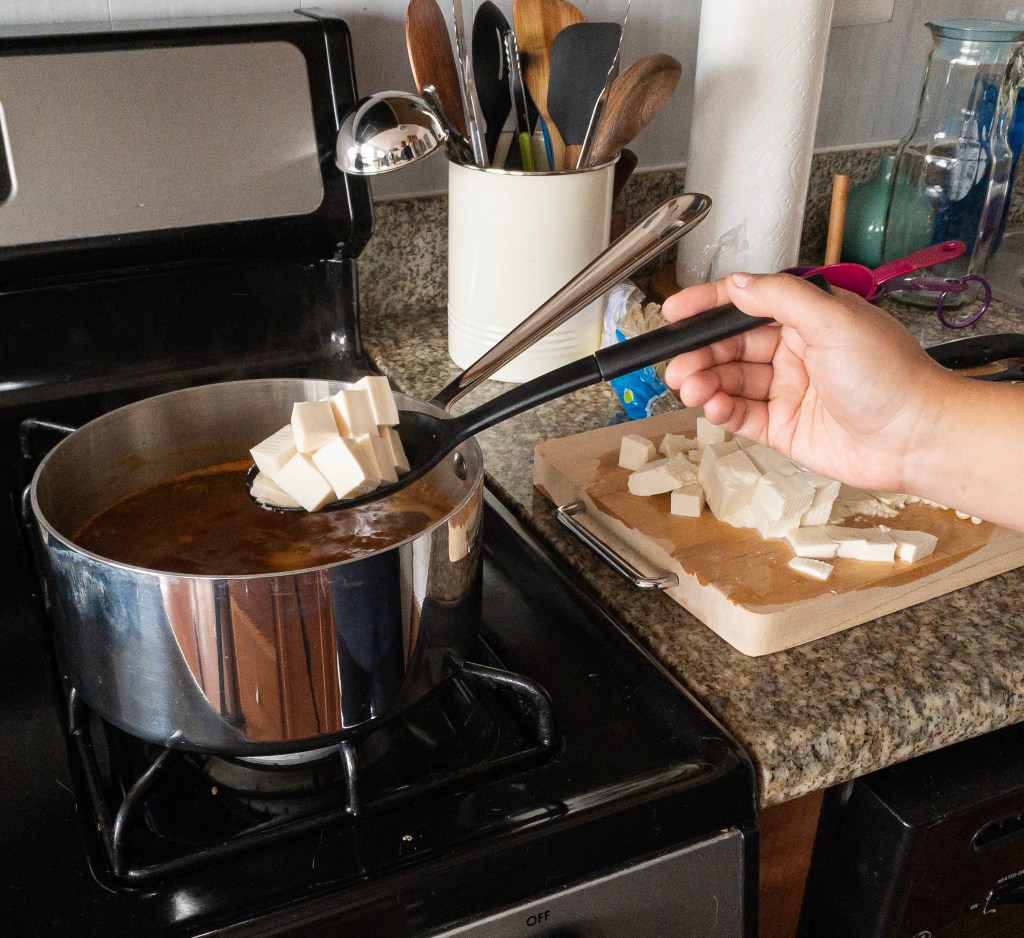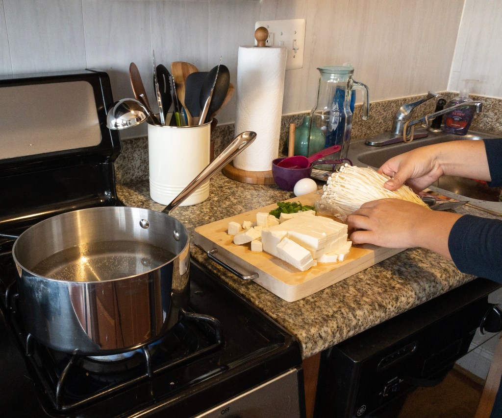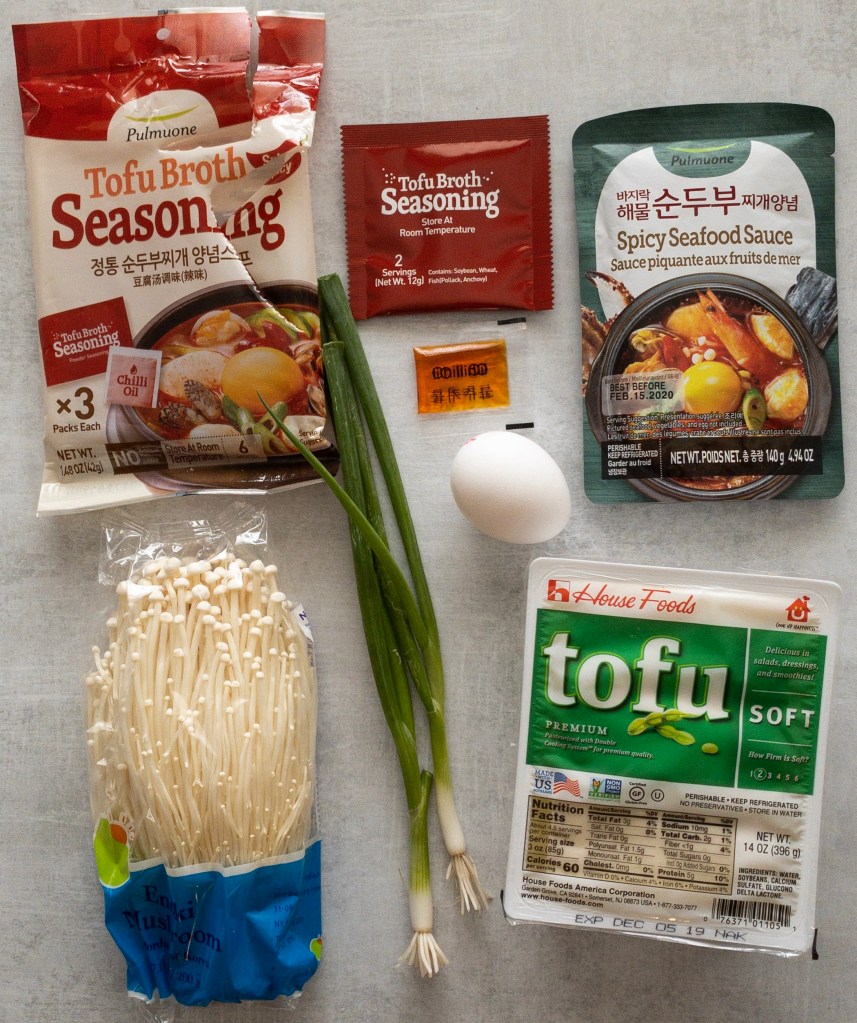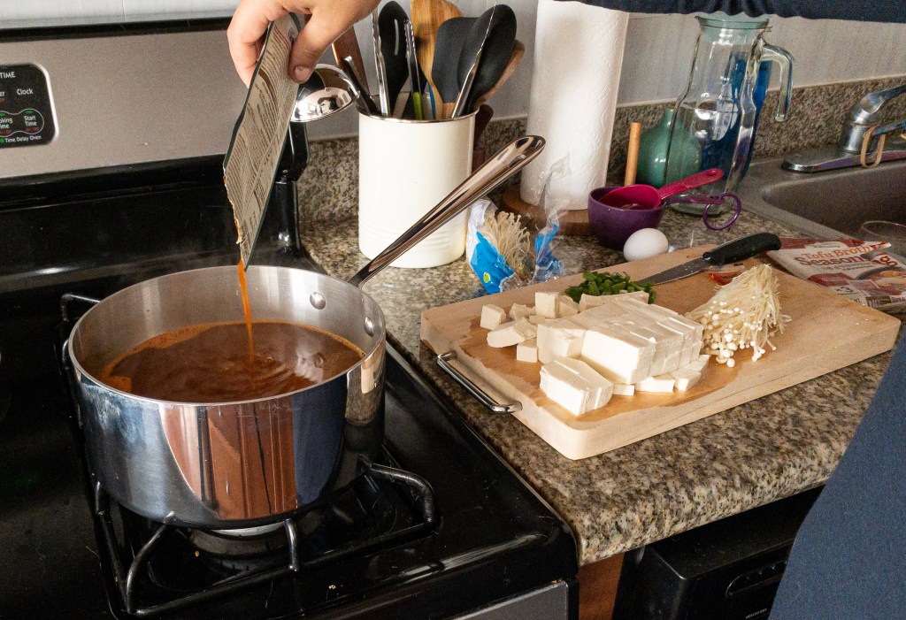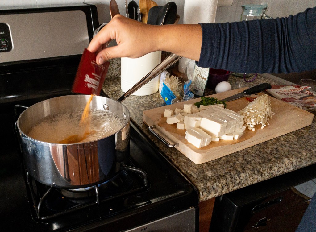 - When the water boils, lower the heat to medium and add 1 packet of the instant spicy tofu soup powder