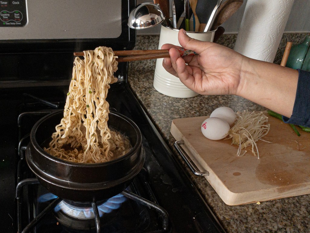 - You’ll know the noodles are halfway cooked when they’re no longer in a box shape, drape easily over your chopsticks or other cooking utensil, and they still have kind of a grainy texture to them.