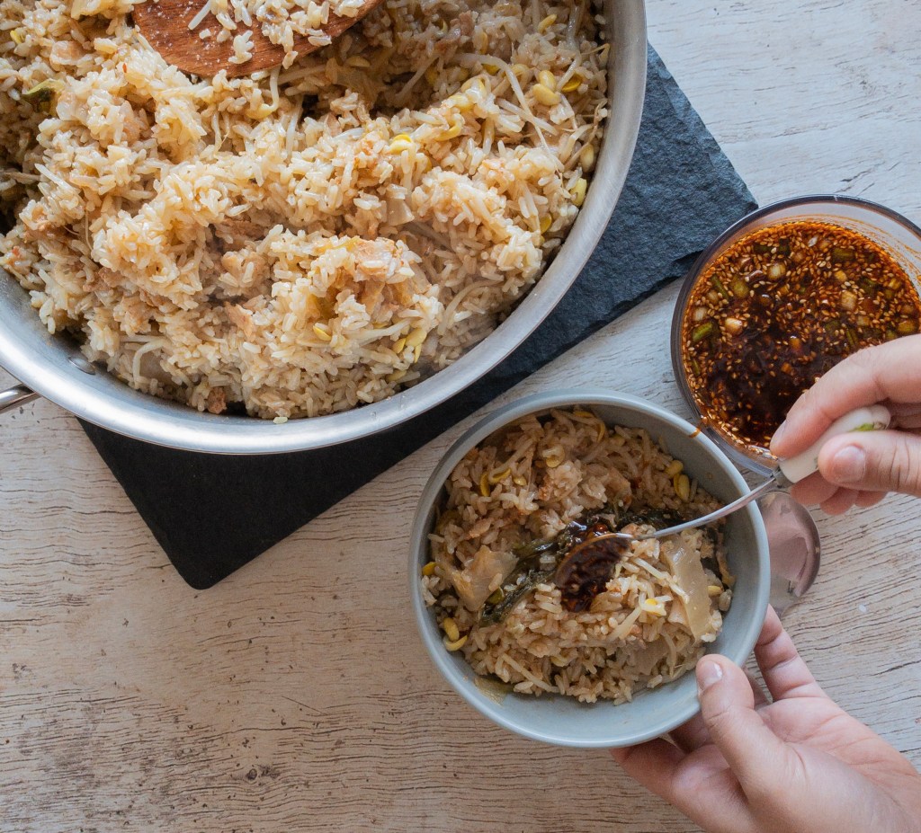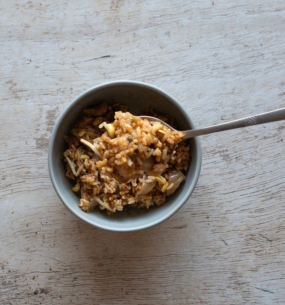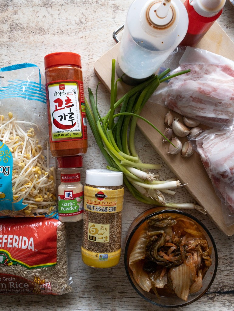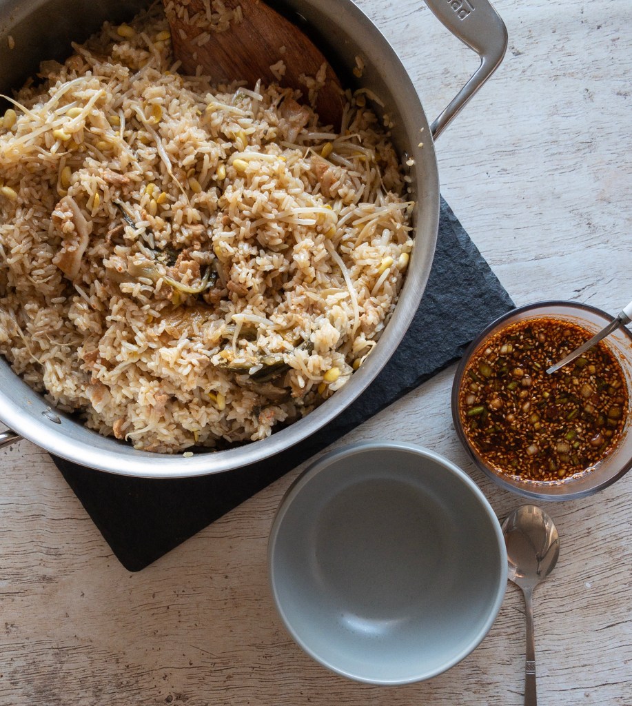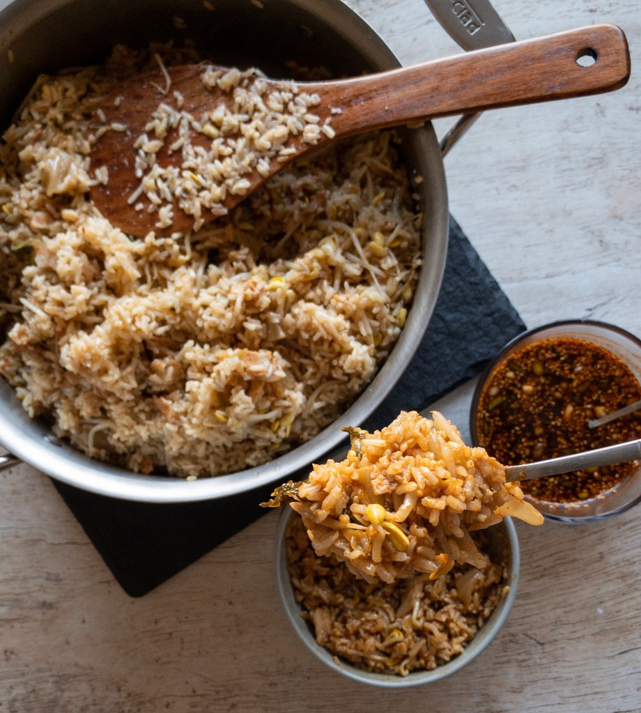 When preparing kimchi bbap, you cook the rice with the liquid from the kimchi, or kimchi 국물 (gugmul), pork, kimchi, and bean sprouts. You then top the dish with 양념 간장 (yangnyeom ganjang), or seasoned soy sauce.