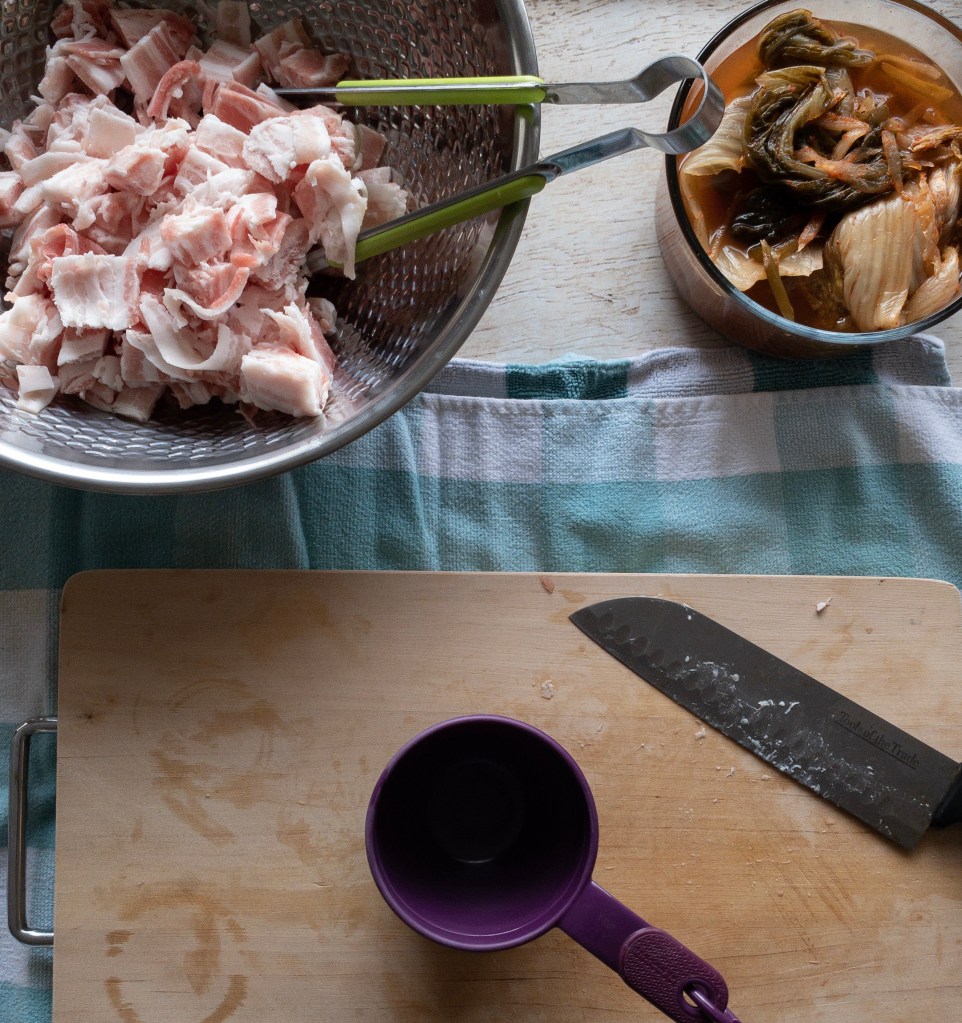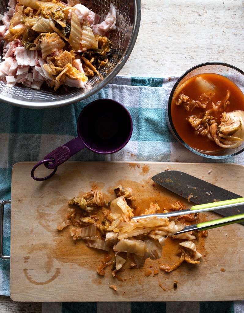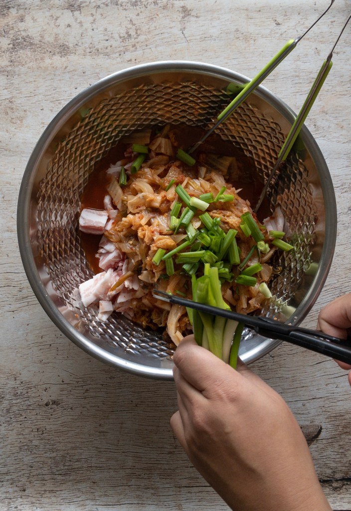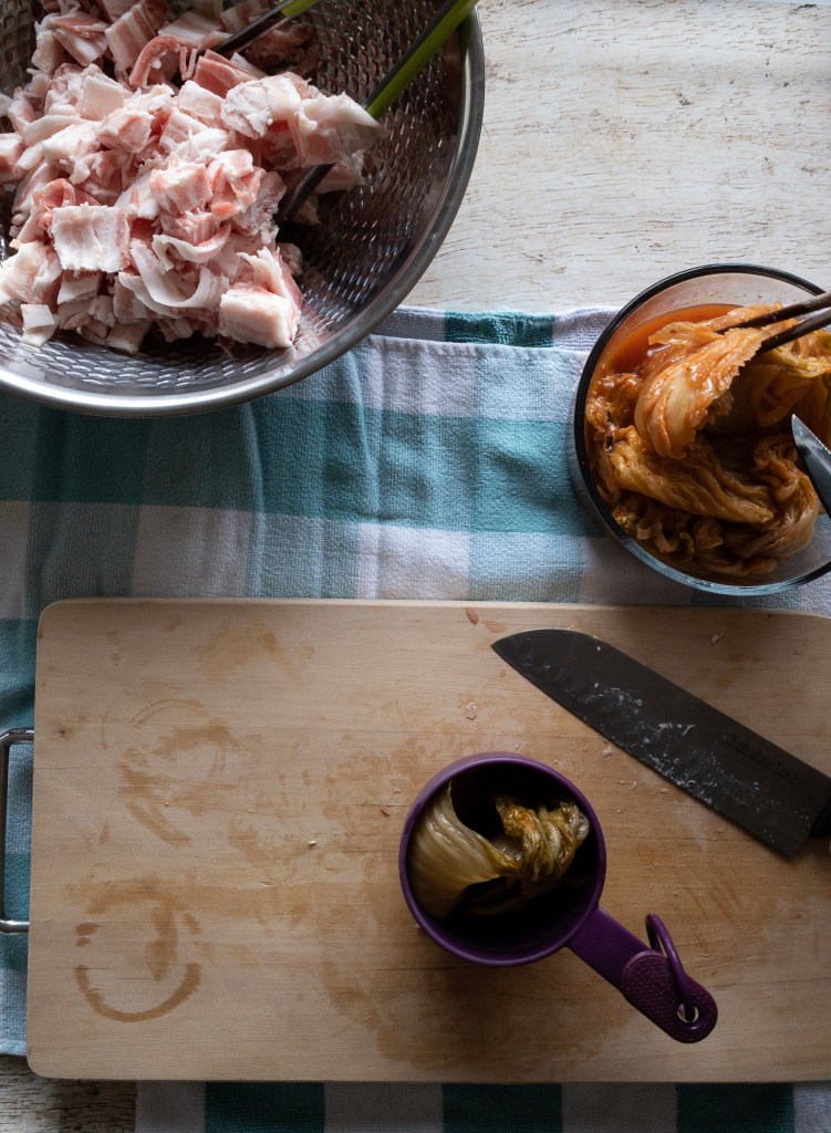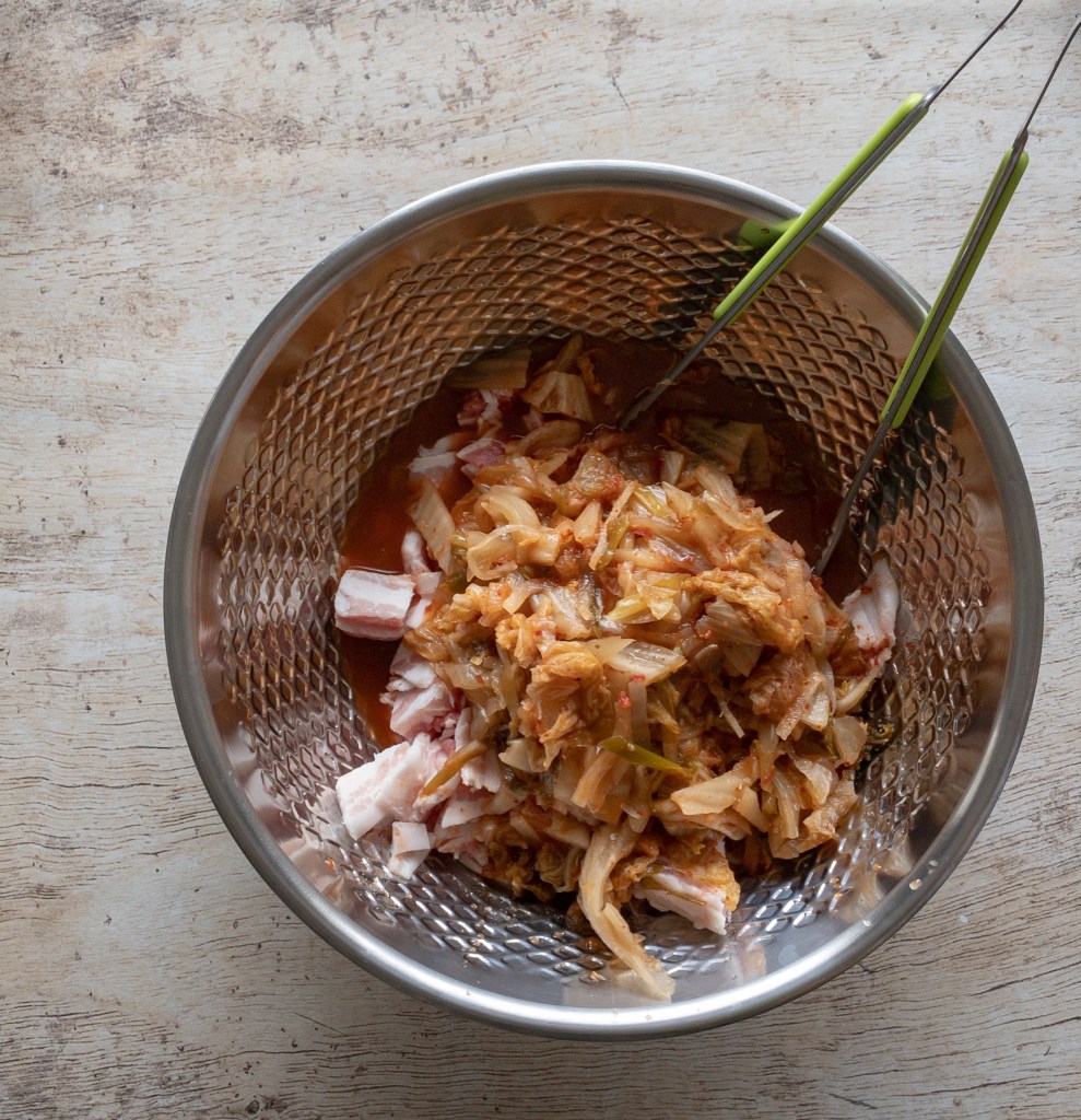 - Cut kimchi into small pieces (roughly the same size as the pork pieces). Add to bowl.