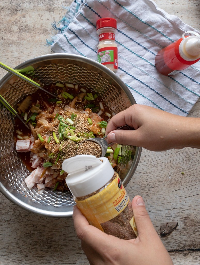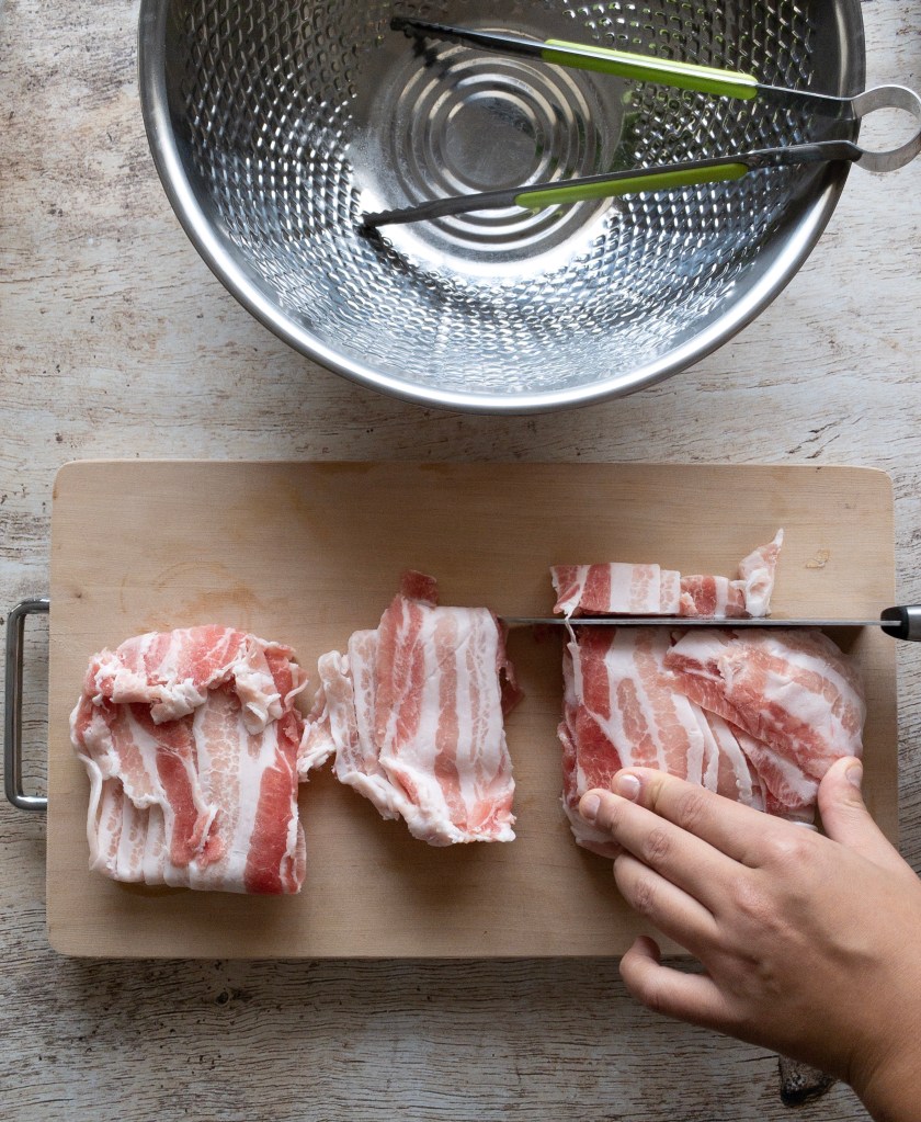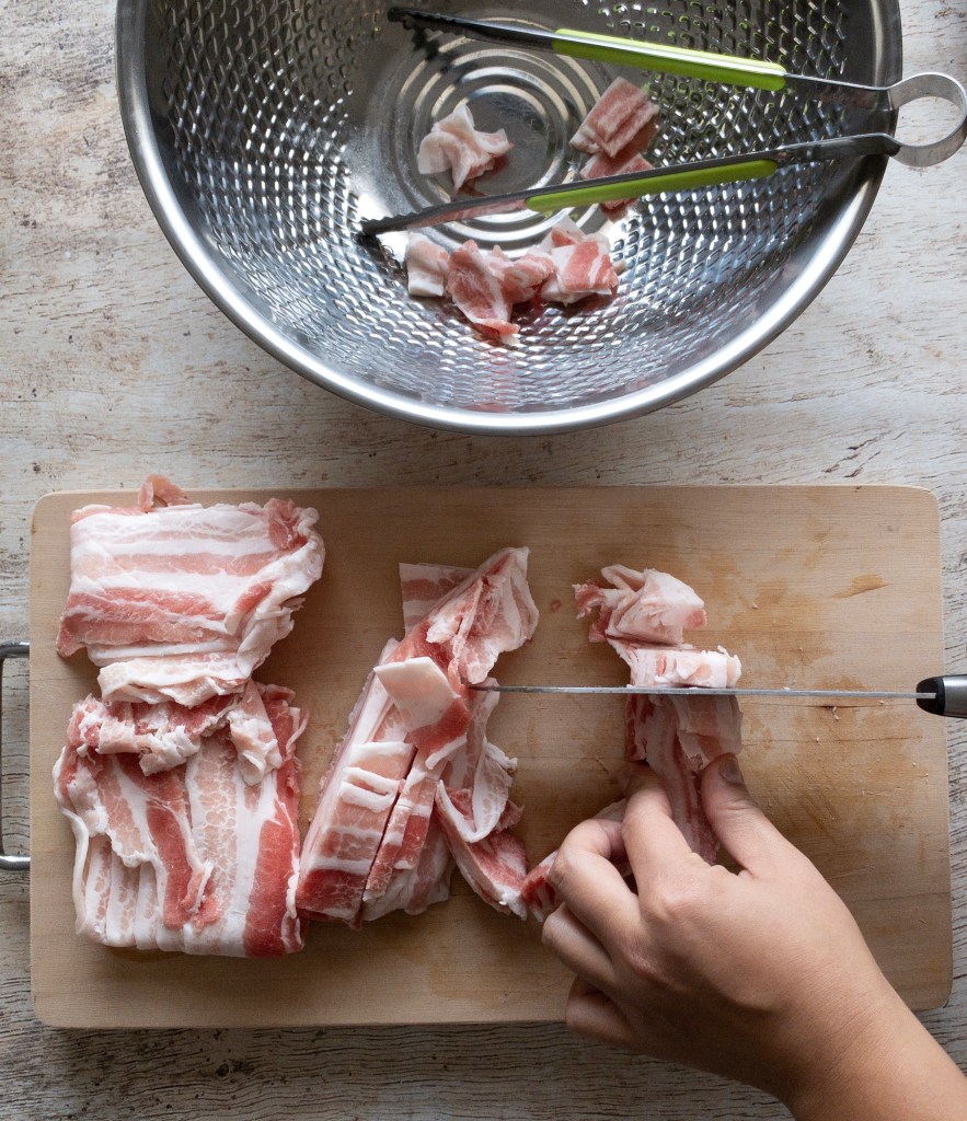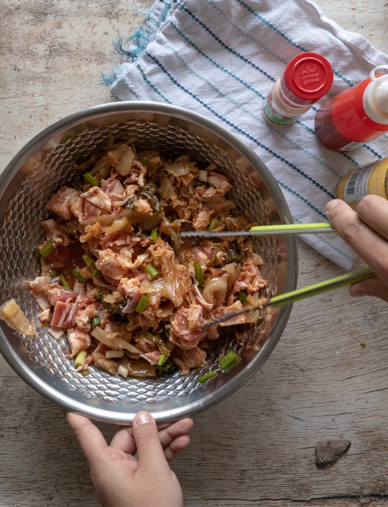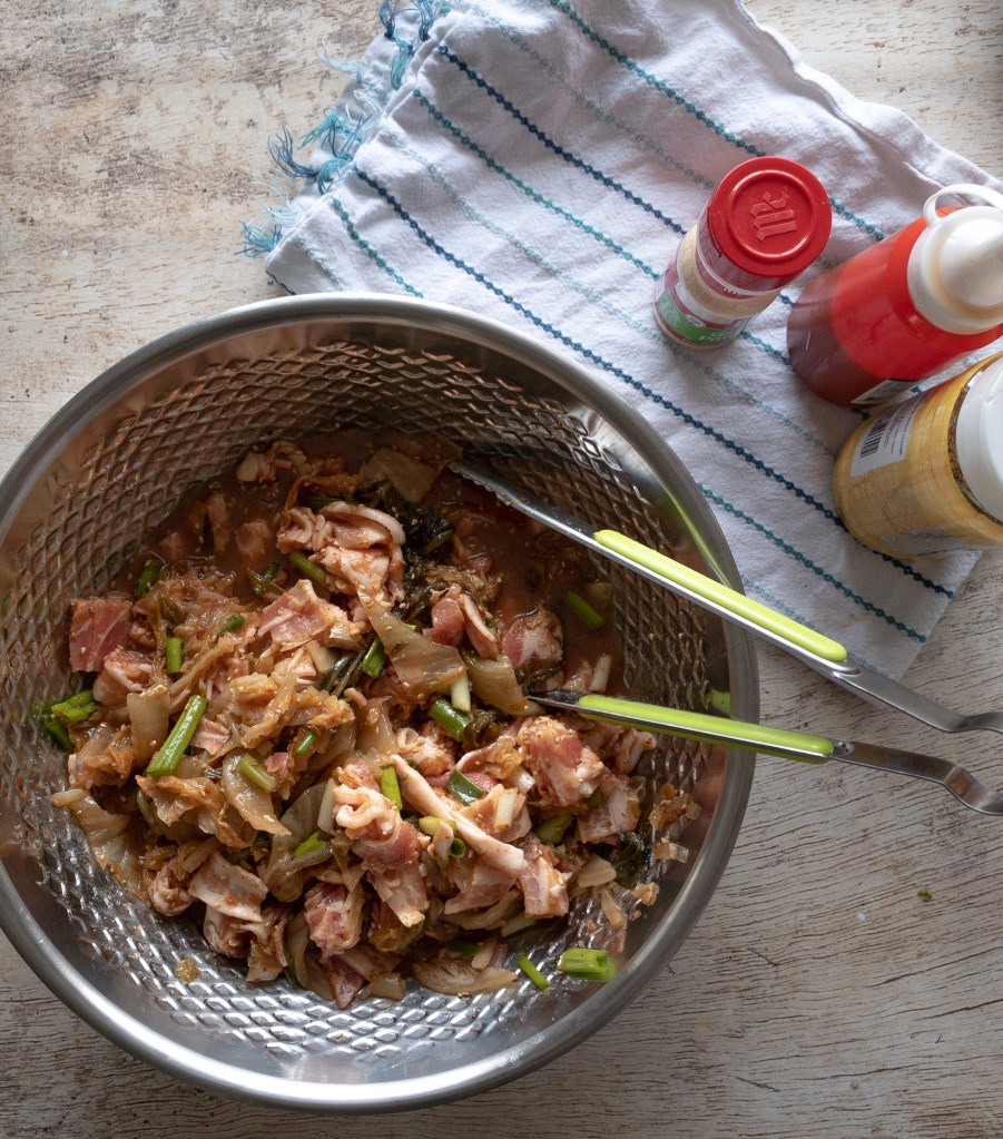 - Cut kimchi into small pieces (roughly the same size as the pork pieces). Add to bowl.