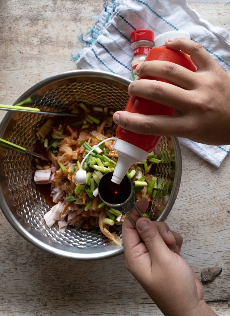 - Add the 8 or 9 tablespoons of soy sauce. Though the range in amount might seems large, keep in mind you’re just seasoning the soy sauce with the scallions, peppers, garlic, and everything else. So if you think you could use more soy sauce and less of everything else, or less soy sauce and more of everything else, there’s a lot of flexibility to adjust the amounts.