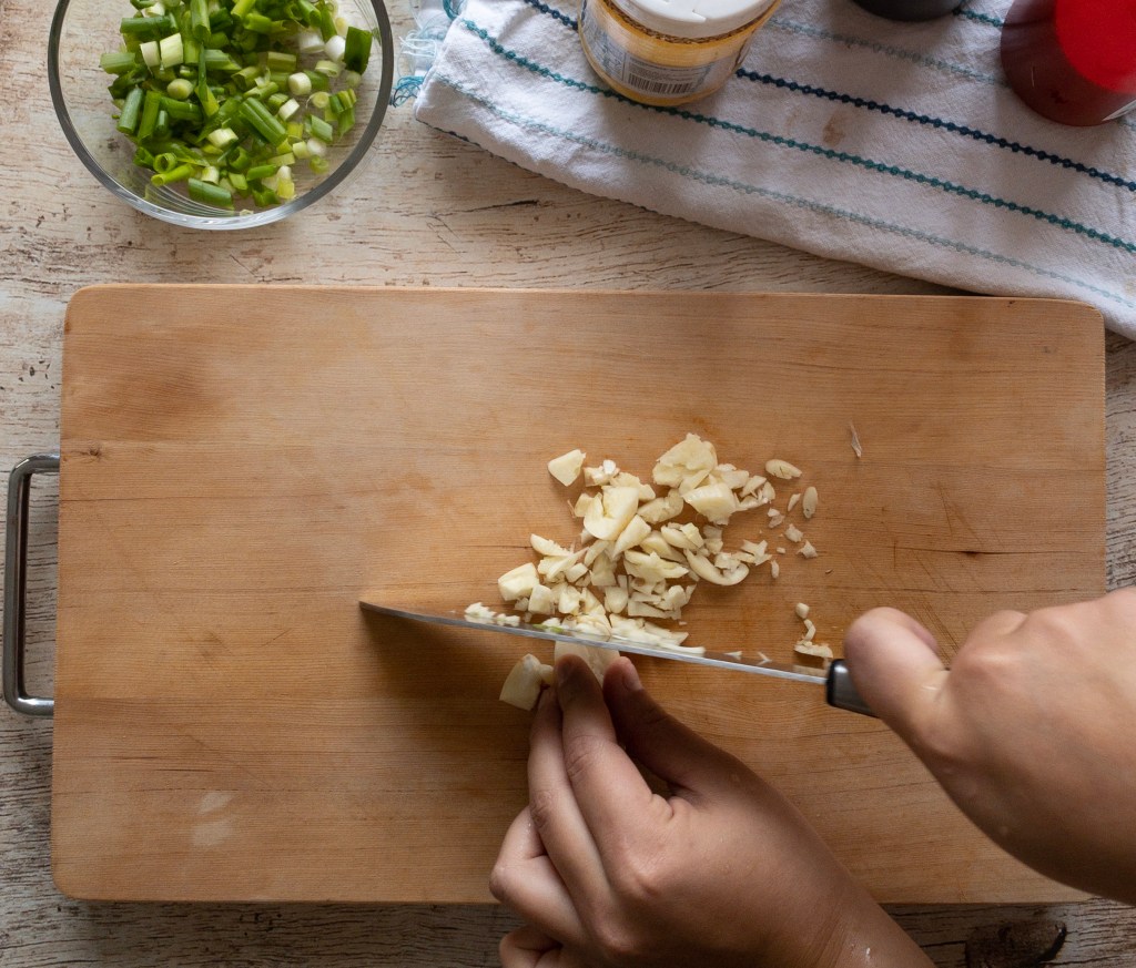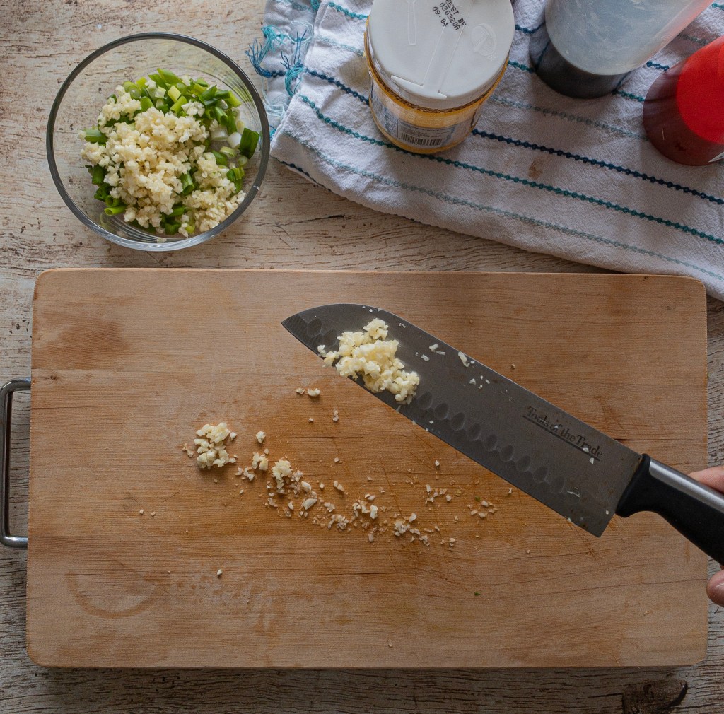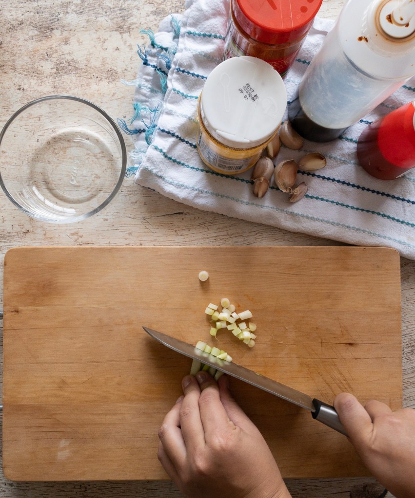 - Chop scallions. Add to small container. We divided the ingredients between two containers so I could take one back to my apartment.