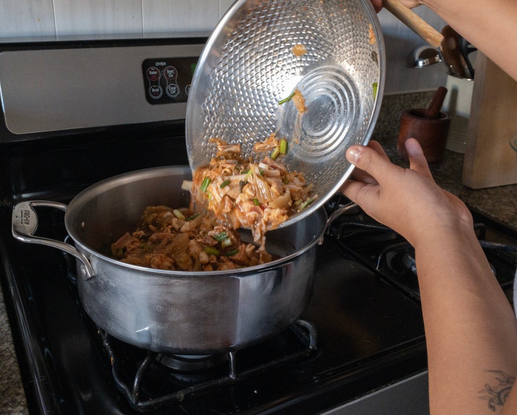 - After 2 hours, transfer the mixed pork to a large pot and place on medium heat. Eventually, you’re going to place rice and bean sprouts on top of the pork, so make sure it’s a big bowl. Cook until pork is done.