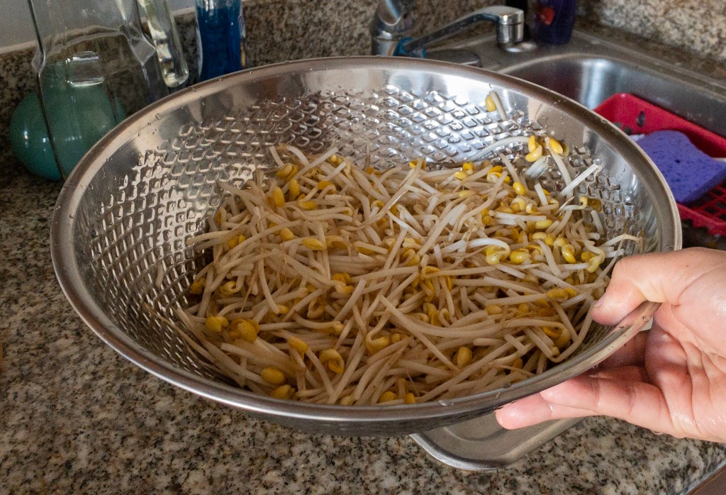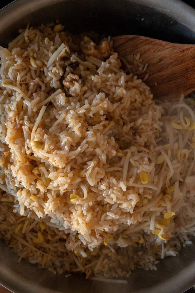 - Add the washed bean sprouts on top of the uncooked rice. Add about 1/2 cup of water on top.