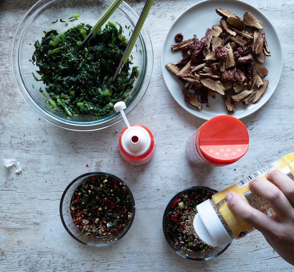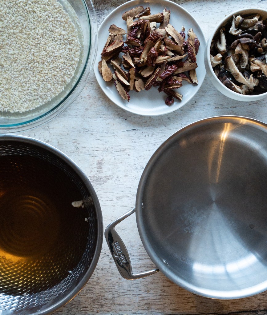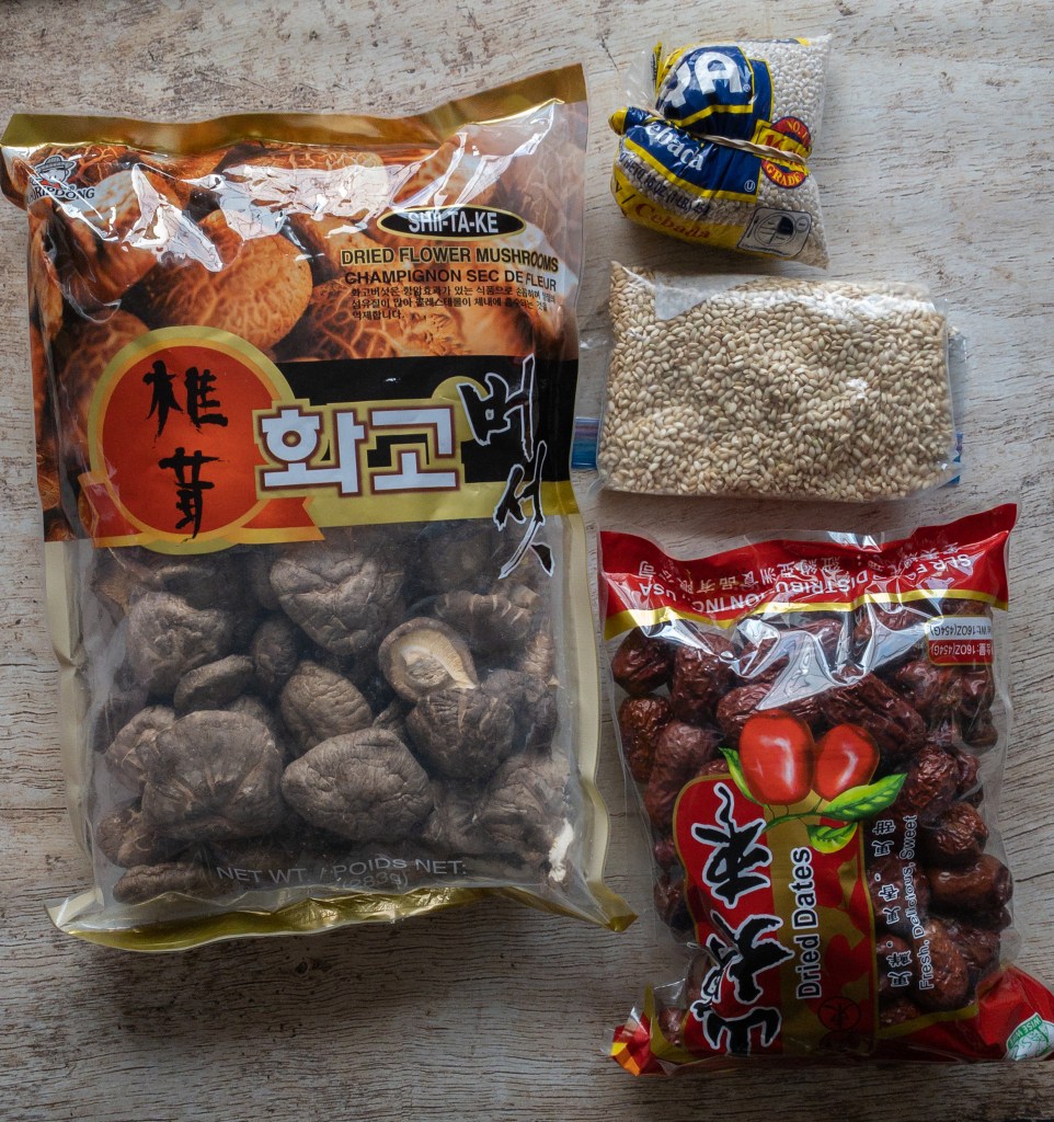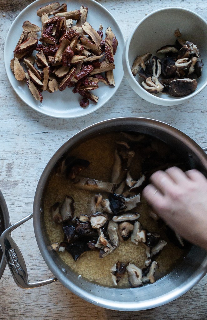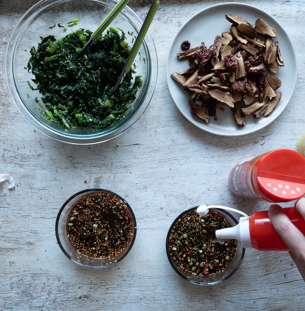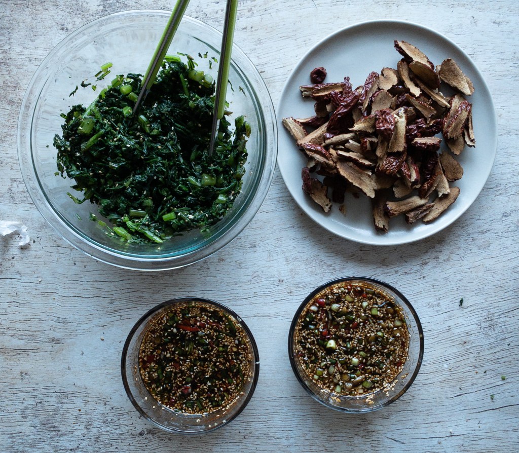 - As the grains and mushrooms soak, slice the dates, and prepare the crown daisy (ssukgat) and seasoned soy sauce (yangnyeom ganjang)!