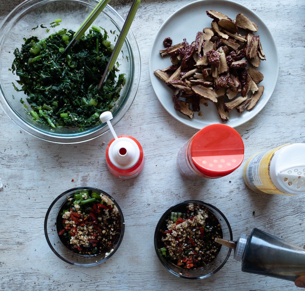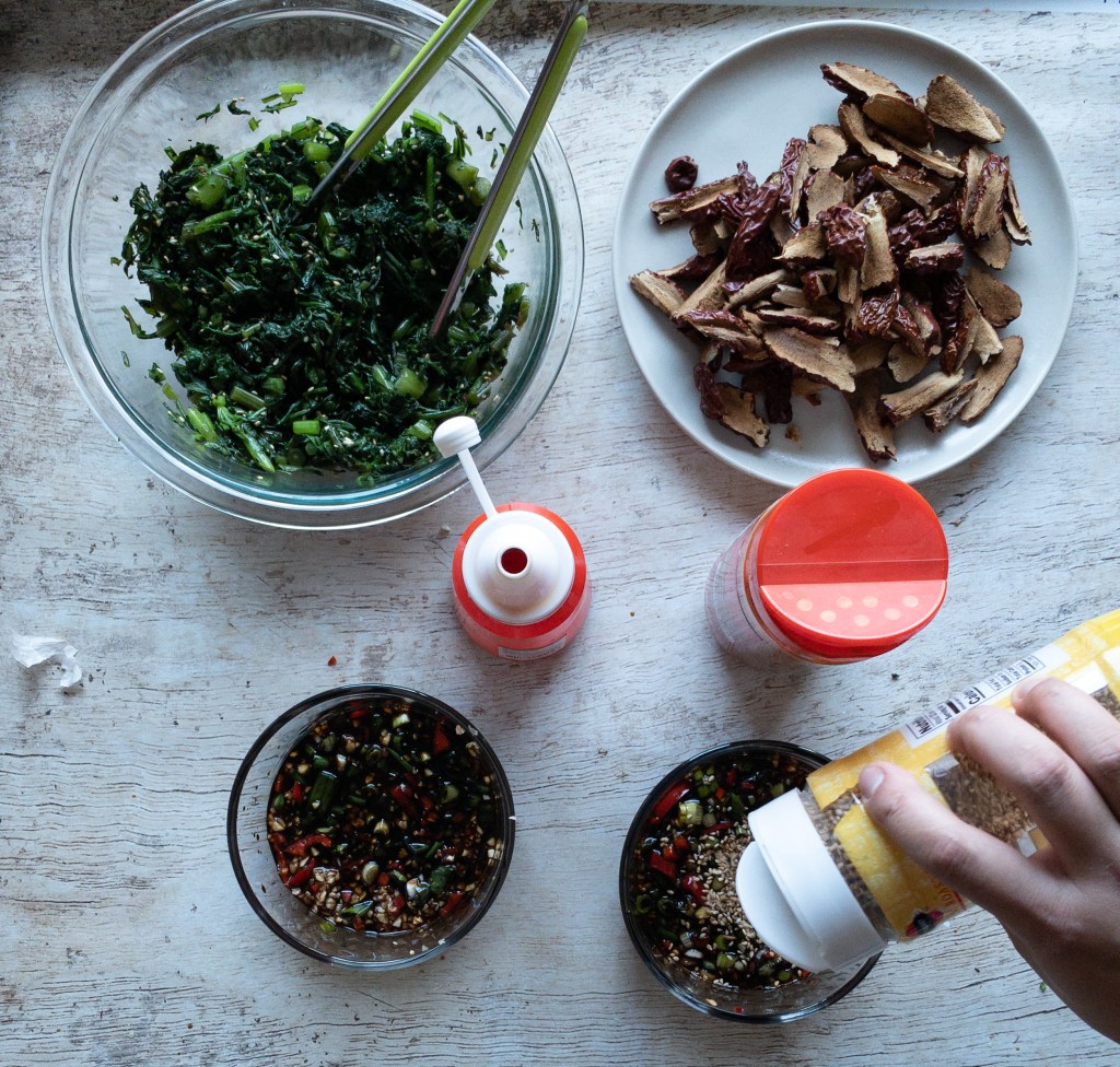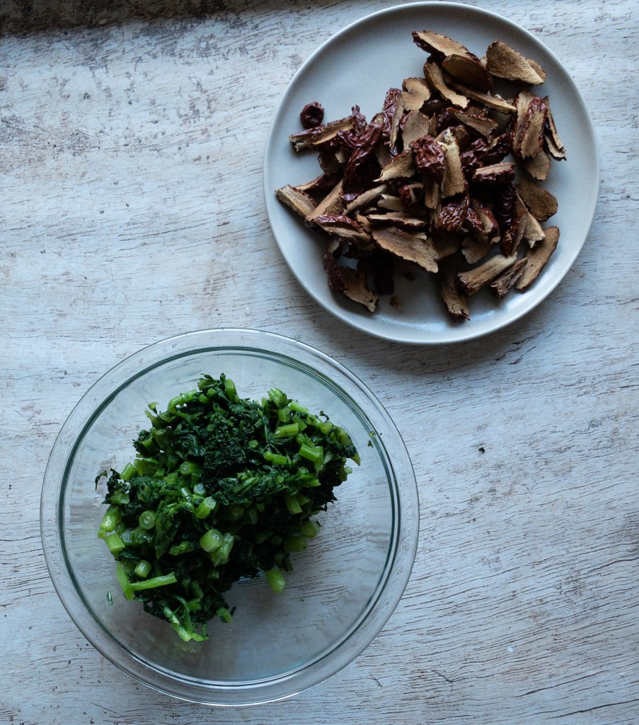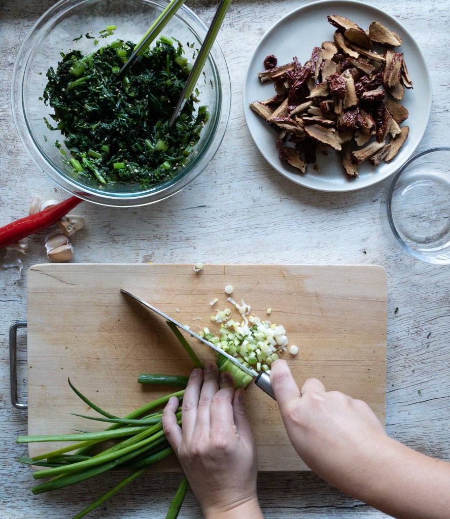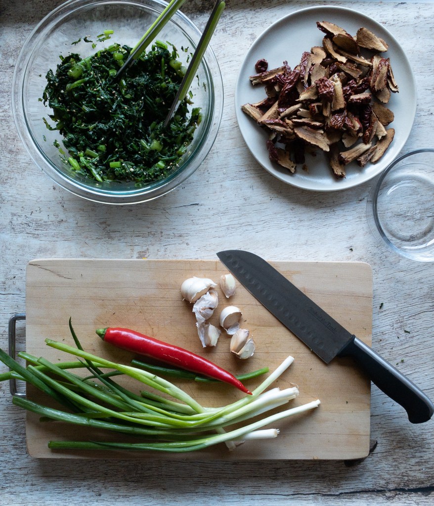 - As the grains and mushrooms soak, slice the dates, and prepare the crown daisy (ssukgat) and seasoned soy sauce (yangnyeom ganjang)!