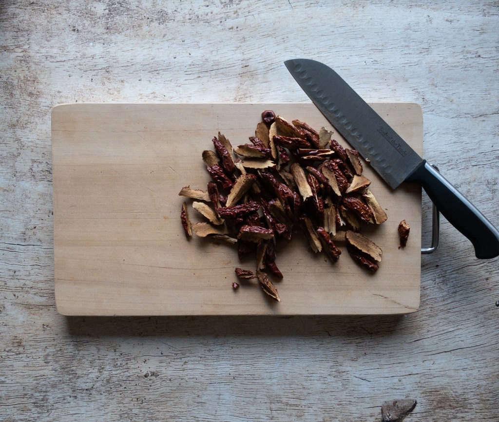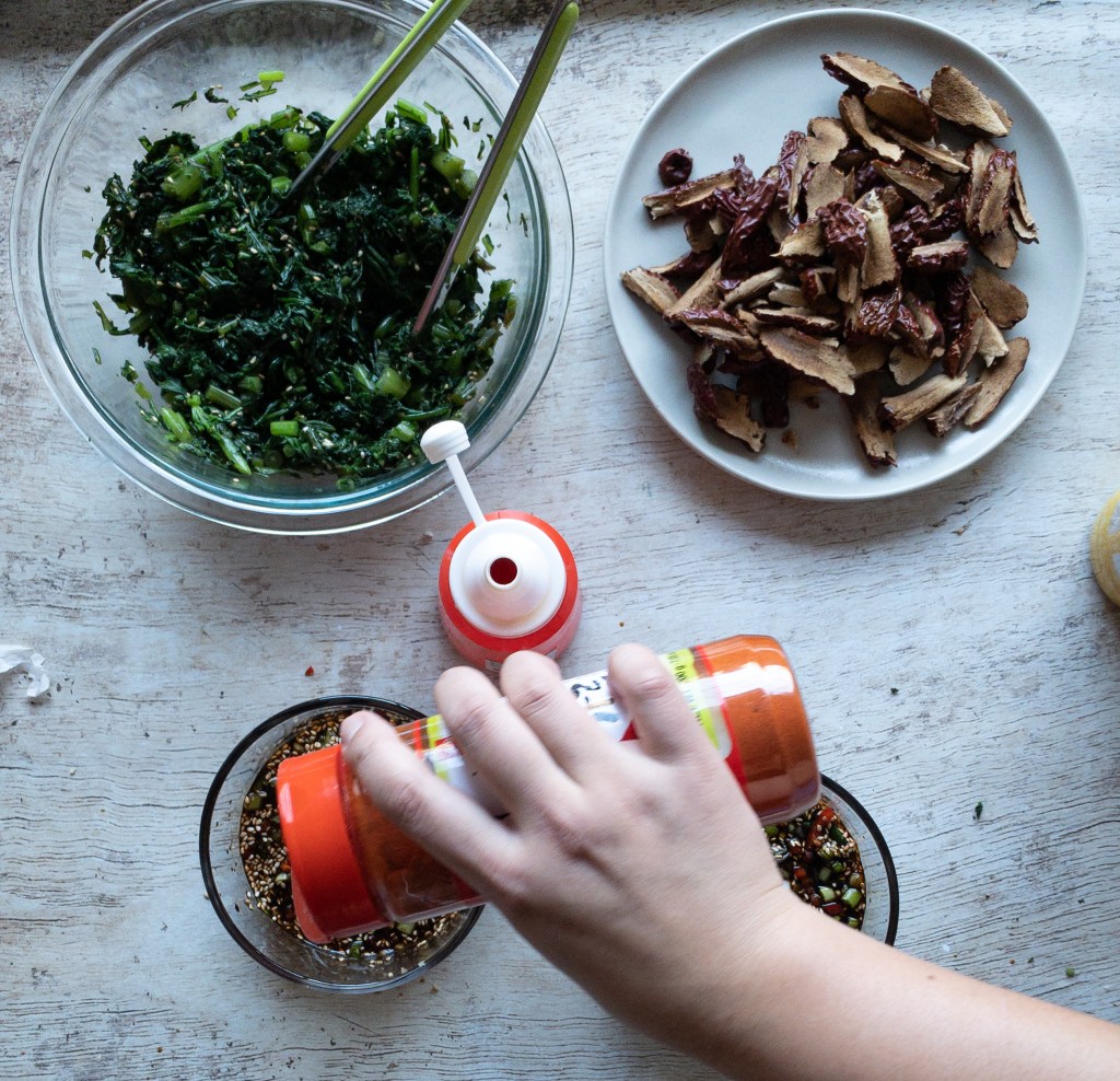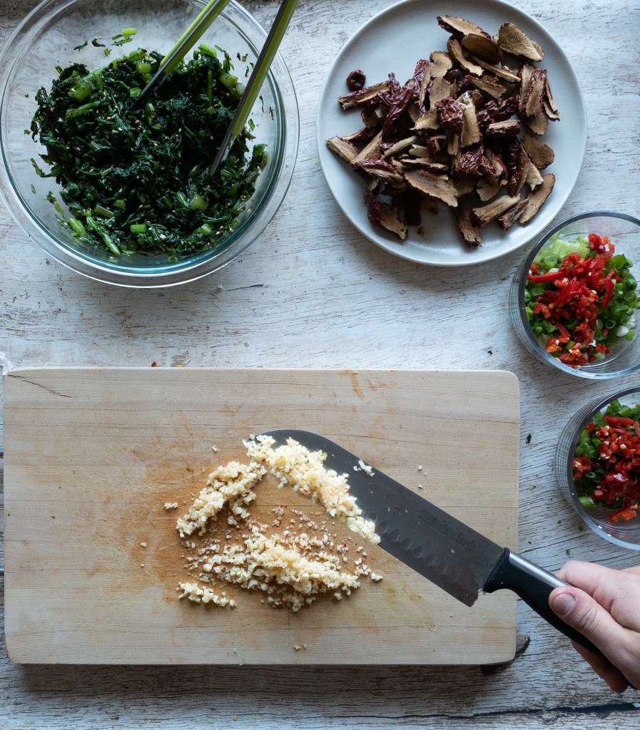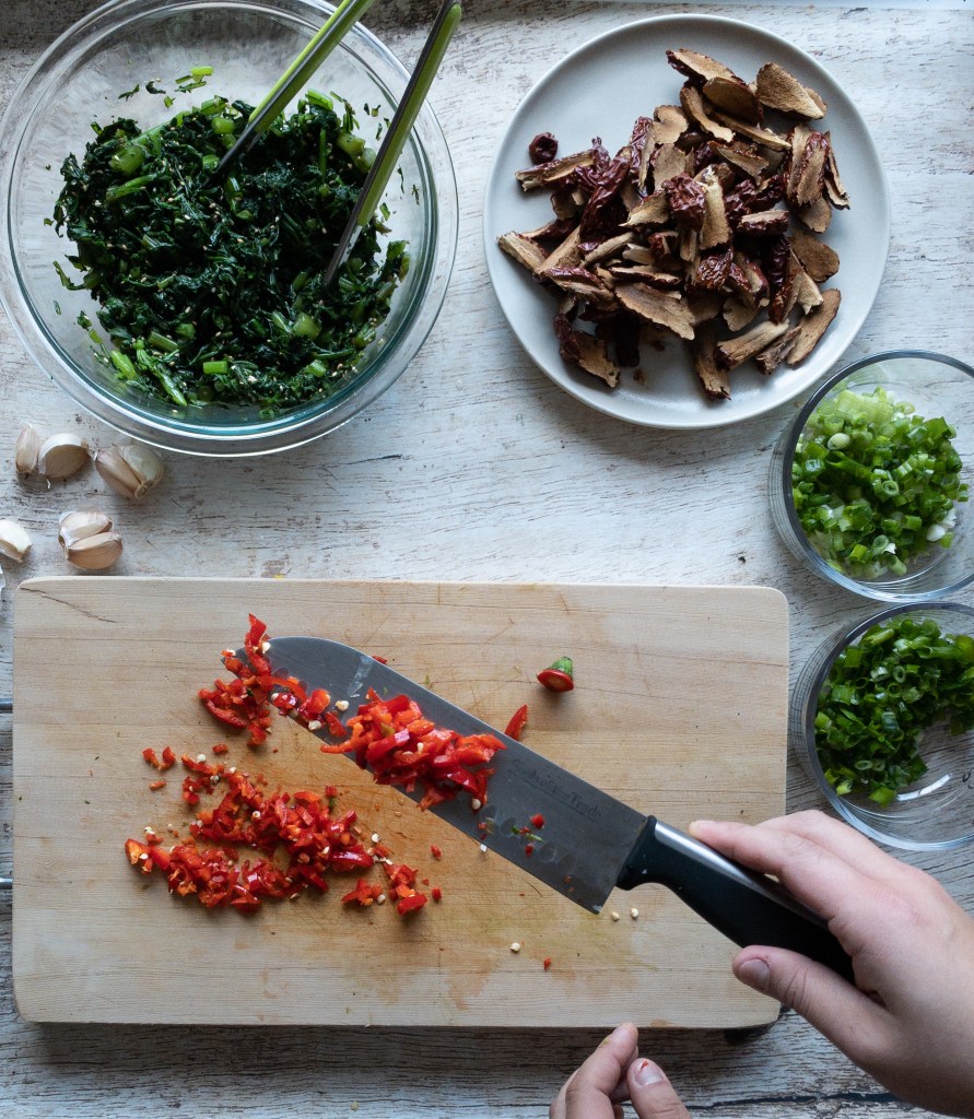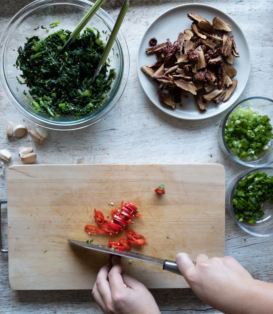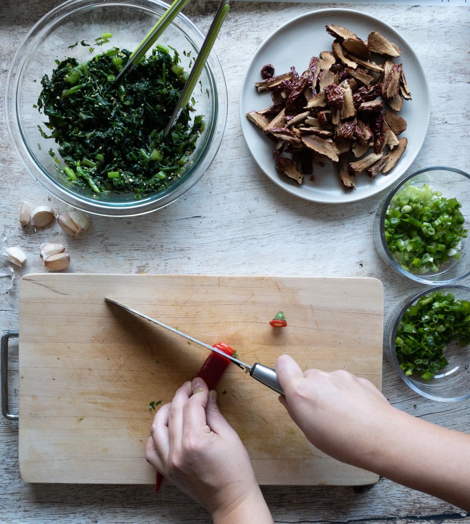 - As the grains and mushrooms soak, slice the dates, and prepare the crown daisy (ssukgat) and seasoned soy sauce (yangnyeom ganjang)!