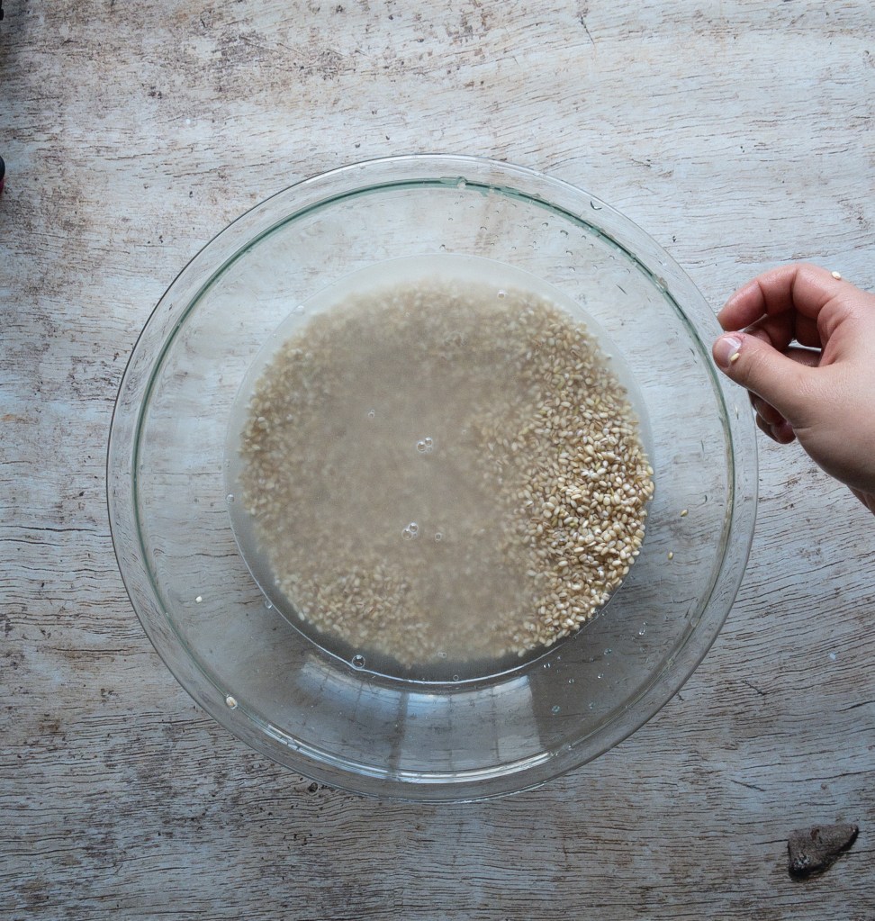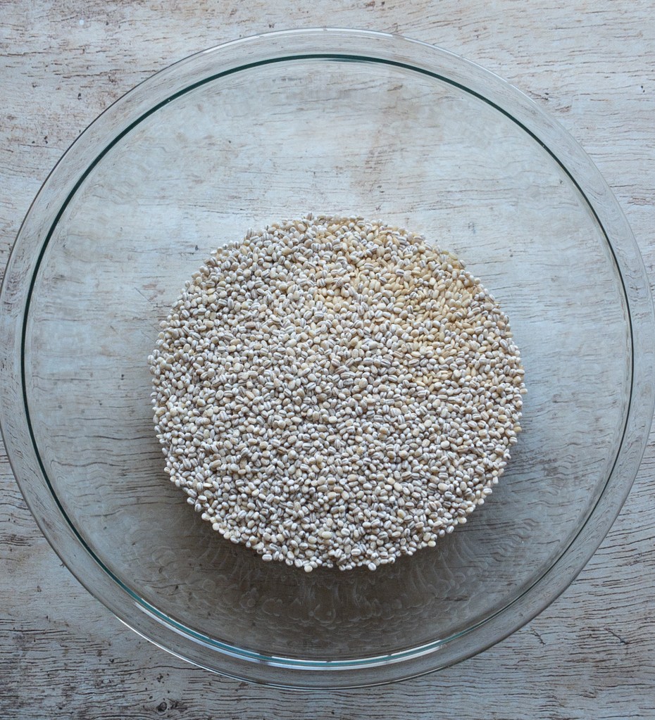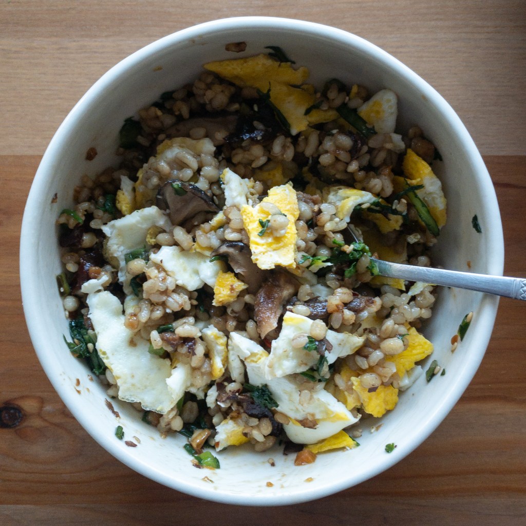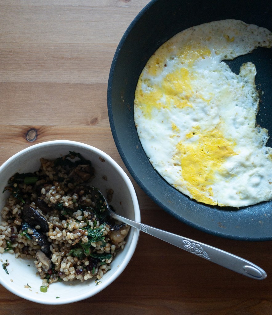 For this updated version of the recipe, I replaced rice with a farro and barley mix, and I added fried eggs!