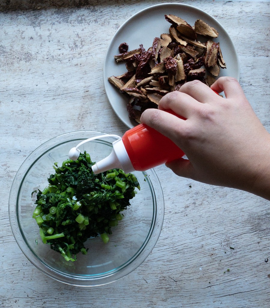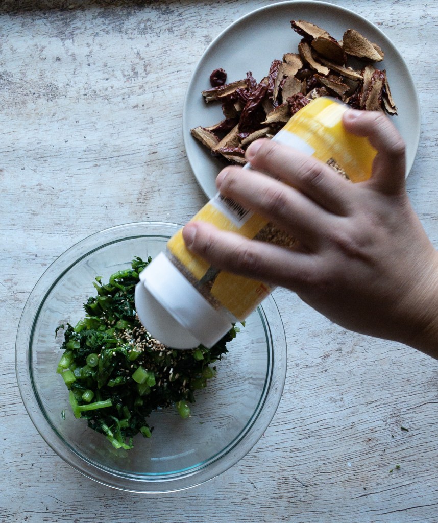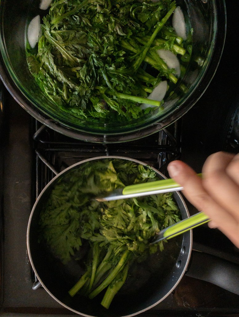 - Chop the crown daisy, then mix it with sesame oil (my mom used wild sesame oil) and sesame seeds. Set aside!