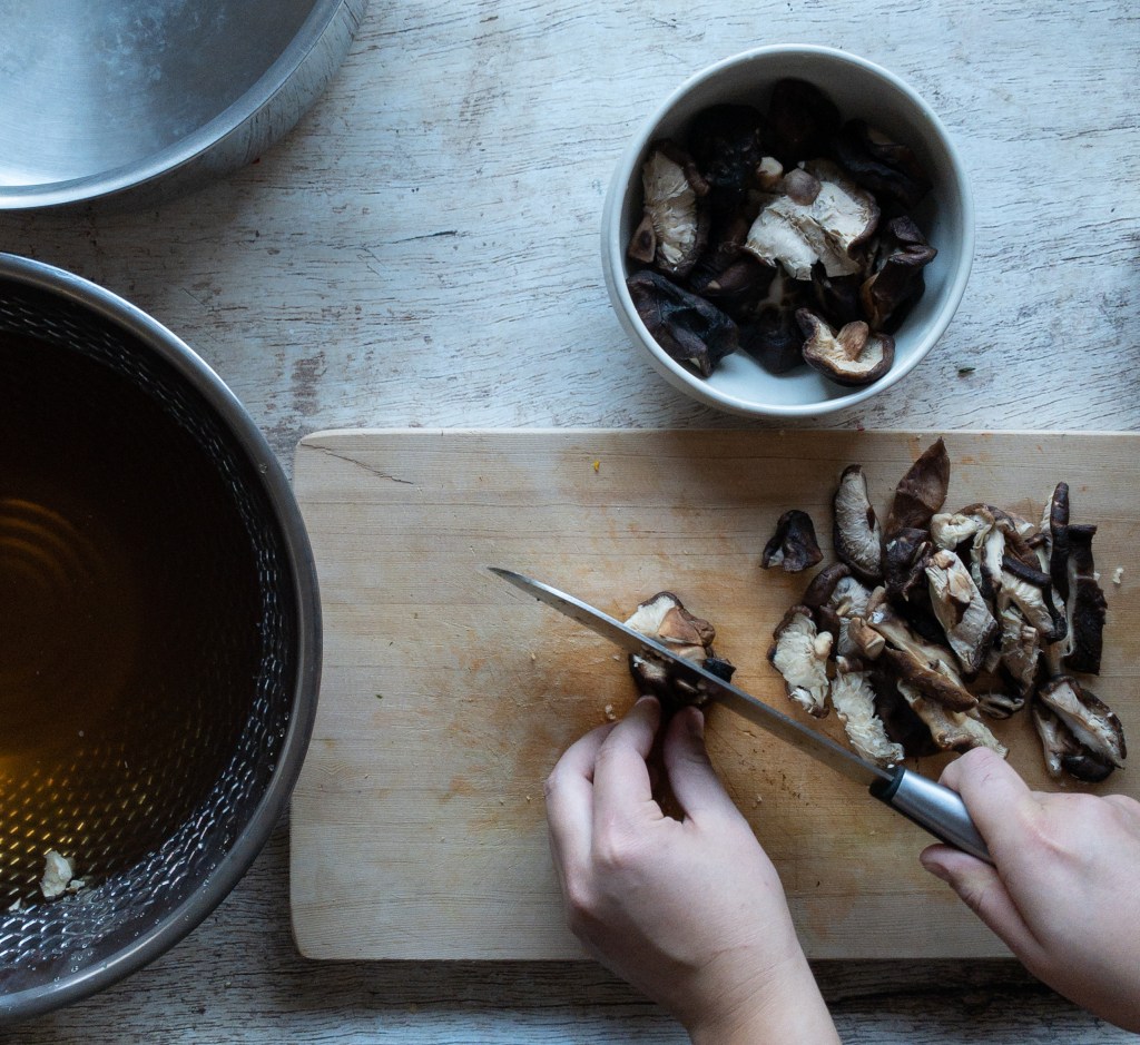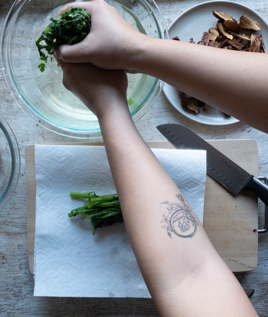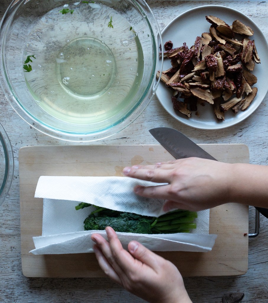- Squeeze the water out of the mushrooms, then slice them. I left in the stems, but you can rip them out, too. Just make sure you don’t discard the water they’ve been soaking in and that you’ve squeezed out of them!