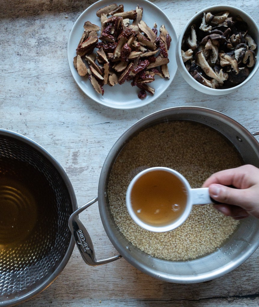- Then, pour the mushroom water into the pot so it ends up sitting about 1/2 inch above the rice.
