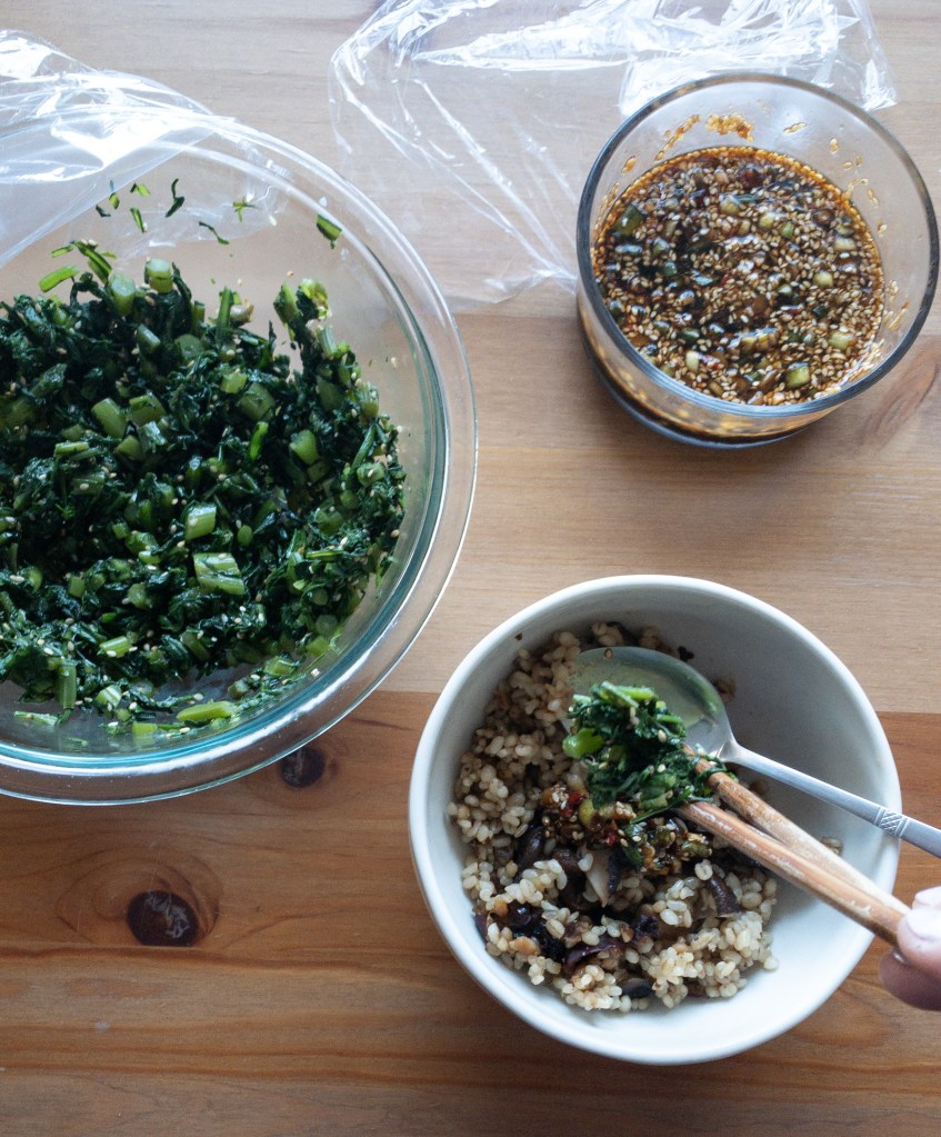 - I then put a few spoonfuls of the crown daisy (ssukgat) and drizzled some of the seasoned soy sauce on top of the rice.